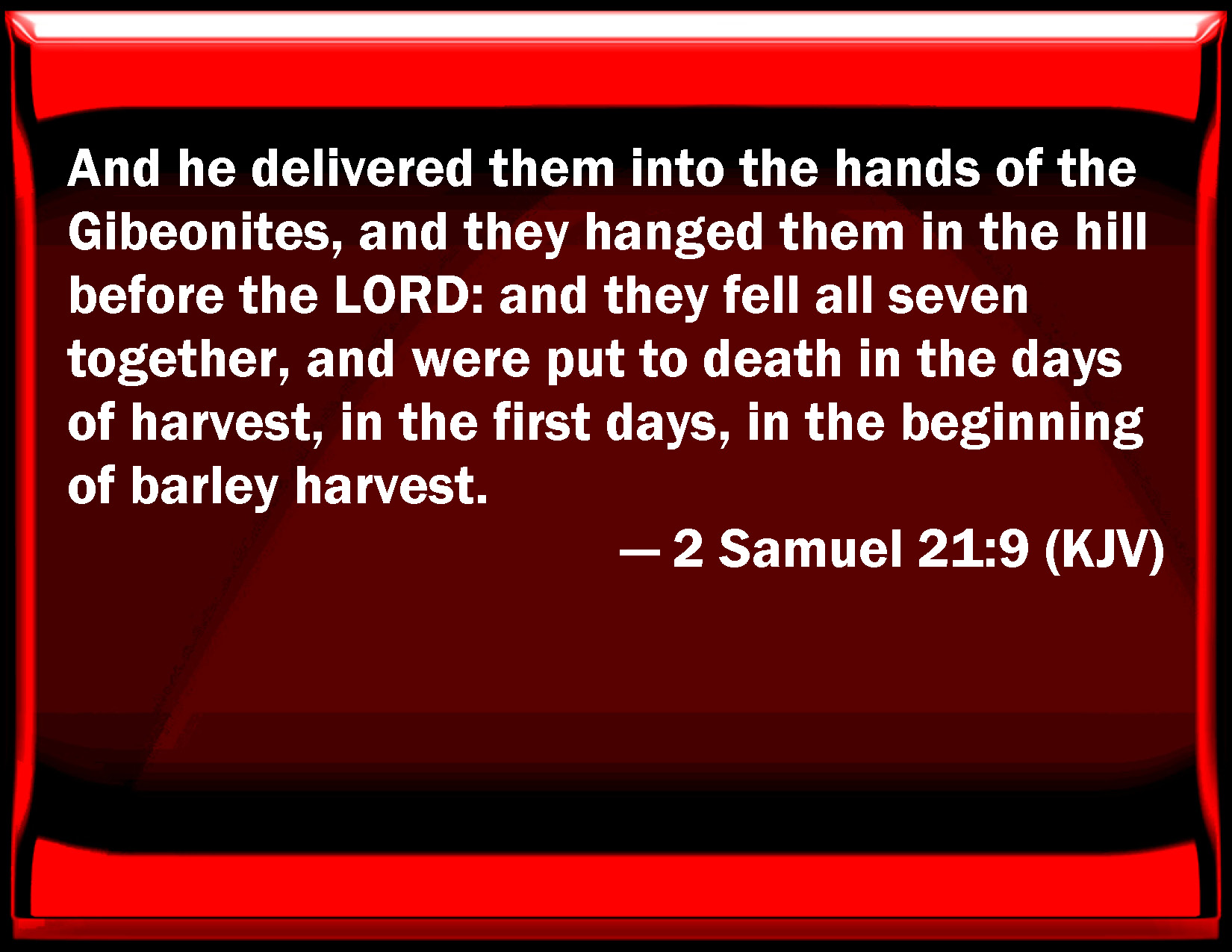Bible Verse Slide 2 Samuel 21:9 And he delivered them into the hands of the Gibeonites, and they hanged them in the hill before the LORD: and they fell all seven together, and were put to death in the days of harvest, in the first days, in the beginning of barley harvest. KJV: And he delivered them into the hands of the Gibeonites, and they hanged them in the hill before the LORD: and they fell all seven together, and were put to death in the days of harvest, in the first days, in the beginning of barley harvest. DRB: And gave them into the hands of the Gabaonites: and they crucified them on a hill before the Lord: and these seven died together in the first days of the harvest, when the barley began to be reaped. DBT: and he gave them into the hands of the Gibeonites, and they hanged them on the hill before Jehovah. And they fell all seven together, and were put to death in the first days of the harvest, in the beginning of barley harvest. ERV: And he delivered them into the hands of the Gibeonites, and they hanged them in the mountain before the LORD, and they fell all seven together: and they were put to death in the days of harvest, in the first days, at the beginning of barley harvest. WBT: And he delivered them into the hands of the Gibeonites, and they hanged them on the hill before the LORD: and they fell all seven together, and were put to death in the days of harvest, in the first days, in the beginning of barley harvest. WEB: He delivered them into the hands of the Gibeonites, and they hanged them in the mountain before Yahweh, and all seven of them fell together. They were put to death in the days of harvest, in the first days, at the beginning of barley harvest. YLT: and giveth them into the hand of the Gibeonites, and they hang them in the hill before Jehovah; and the seven fall together, and they have been put to death in the days of harvest, in the first days, the commencement of barley-harvest.Links 2 Samuel 21:9 NIV • 2 Samuel 21:9 NLT • 2 Samuel 21:9 ESV • 2 Samuel 21:9 NASB • 2 Samuel 21:9 KJV • 2 Samuel 21:9 Interlinear • 2 Samuel 21:9 Commentaries • 2 Samuel 21:9 Parallel Texts • 2 Samuel 21:9 Bible Apps • 2 Samuel 21:9 Parallel • Bible Hub |