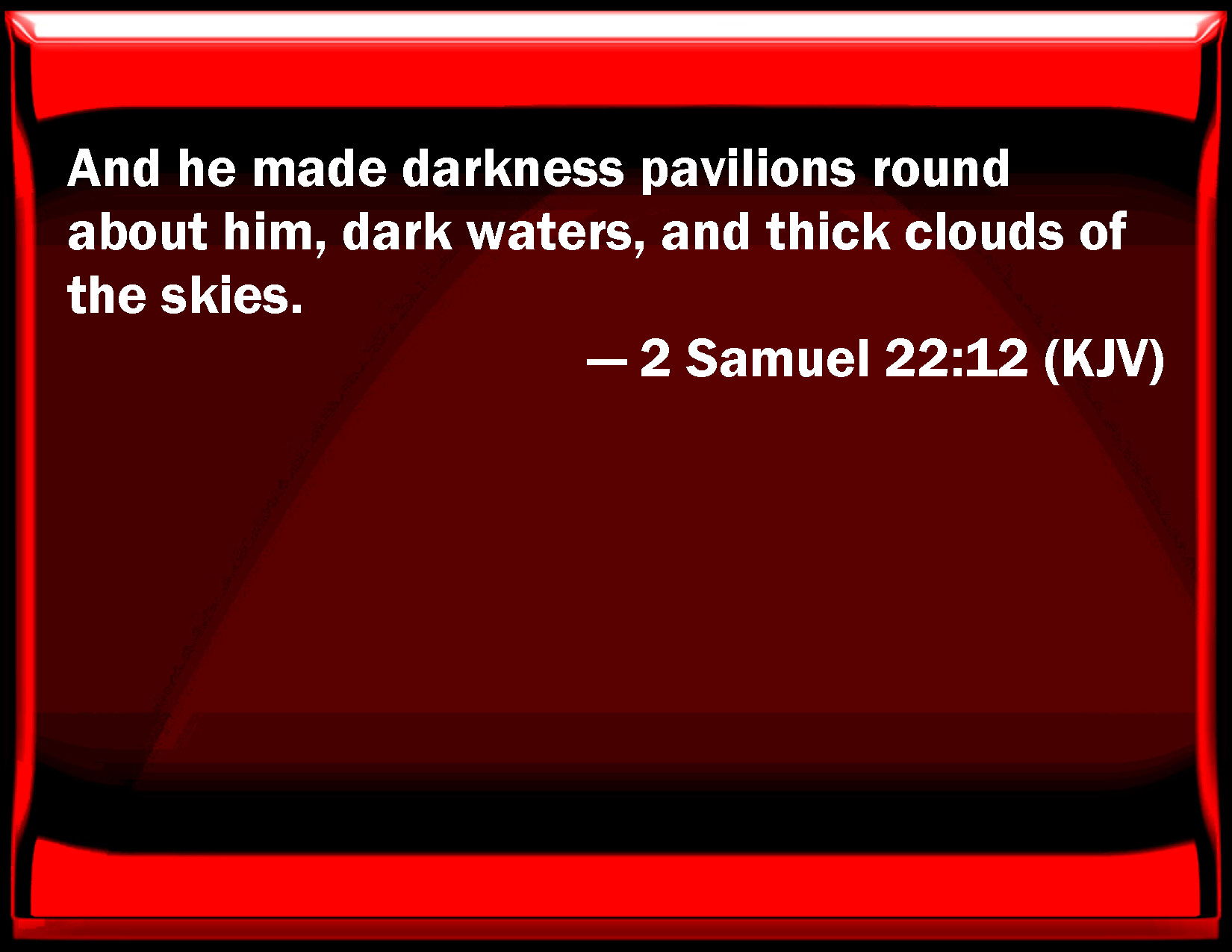Bible Verse Slide 2 Samuel 22:12 And he made darkness pavilions round about him, dark waters, and thick clouds of the skies. KJV: And he made darkness pavilions round about him, dark waters, and thick clouds of the skies. DRB: He made darkness a covering round about him: dropping waters out of the clouds of the heavens. DBT: And he made darkness round about him a tent, Gatherings of waters, thick clouds of the skies. ERV: And he made darkness pavilions round about him, gathering of waters, thick clouds of the skies. WBT: And he made darkness pavilions around him, dark waters, and thick clouds of the skies. WEB: He made darkness pavilions around himself: gathering of waters, and thick clouds of the skies. YLT: And He setteth darkness Round about Him — tabernacles, Darkness of waters — thick clouds of the skies.Links 2 Samuel 22:12 NIV • 2 Samuel 22:12 NLT • 2 Samuel 22:12 ESV • 2 Samuel 22:12 NASB • 2 Samuel 22:12 KJV • 2 Samuel 22:12 Interlinear • 2 Samuel 22:12 Commentaries • 2 Samuel 22:12 Parallel Texts • 2 Samuel 22:12 Bible Apps • 2 Samuel 22:12 Parallel • Bible Hub |