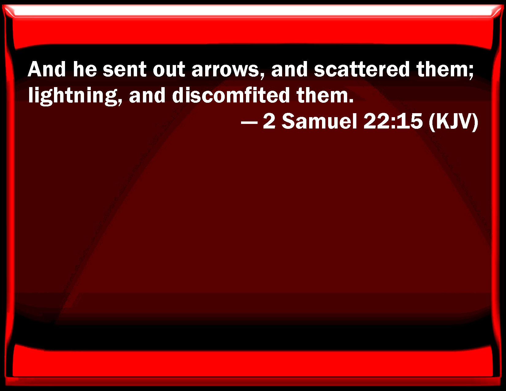 Bible Verse Slide 2 Samuel 22:15 And he sent out arrows, and scattered them; lightning, and discomfited them. KJV: And he sent out arrows, and scattered them; lightning, and discomfited them. DRB: He shot arrows and scattered them: lightning, and consumed them. DBT: And he sent arrows, and scattered mine enemies; Lightning, and discomfited them. ERV: And he sent out arrows, and scattered them; lightning, and discomfited them. WBT: And he sent out arrows, and scattered them; lightning, and discomfited them. WEB: He sent out arrows, and scattered them; lightning, and confused them. YLT: And He sendeth forth arrows, And scattereth them; Lightning, and troubleth them;Links 2 Samuel 22:15 NIV • 2 Samuel 22:15 NLT • 2 Samuel 22:15 ESV • 2 Samuel 22:15 NASB • 2 Samuel 22:15 KJV • 2 Samuel 22:15 Interlinear • 2 Samuel 22:15 Commentaries • 2 Samuel 22:15 Parallel Texts • 2 Samuel 22:15 Bible Apps • 2 Samuel 22:15 Parallel • Bible Hub |