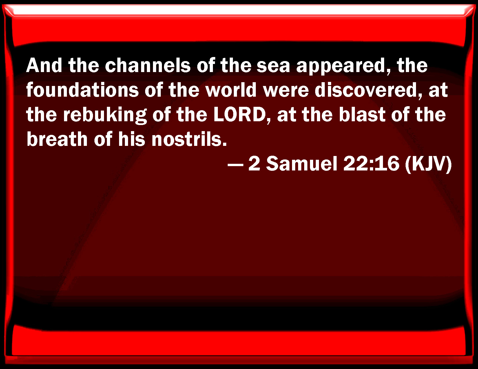 Bible Verse Slide 2 Samuel 22:16 And the channels of the sea appeared, the foundations of the world were discovered, at the rebuking of the LORD, at the blast of the breath of his nostrils. KJV: And the channels of the sea appeared, the foundations of the world were discovered, at the rebuking of the LORD, at the blast of the breath of his nostrils. DRB: And the overflowings of the sea appeared, and the foundations of the world were laid open at the rebuke of the Lord, at the blast of the spirit of his wrath. DBT: And the beds of the sea were seen, The foundations of the world were uncovered At the rebuke of Jehovah, At the blast of the breath of his nostrils. ERV: Then the channels of the sea appeared, the foundations of the world were laid bare, by the rebuke of the LORD, at the blast of the breath of his nostrils. WBT: And the channels of the sea appeared, the foundations of the world were laid open, at the rebuking of the LORD, at the blast of the breath of his nostrils. WEB: Then the channels of the sea appeared. The foundations of the world were laid bare by the rebuke of Yahweh, At the blast of the breath of his nostrils. YLT: And seen are the streams of the sea, Revealed are foundations of the world, By the rebuke of Jehovah, From the breath of the spirit of His anger.Links 2 Samuel 22:16 NIV • 2 Samuel 22:16 NLT • 2 Samuel 22:16 ESV • 2 Samuel 22:16 NASB • 2 Samuel 22:16 KJV • 2 Samuel 22:16 Interlinear • 2 Samuel 22:16 Commentaries • 2 Samuel 22:16 Parallel Texts • 2 Samuel 22:16 Bible Apps • 2 Samuel 22:16 Parallel • Bible Hub |