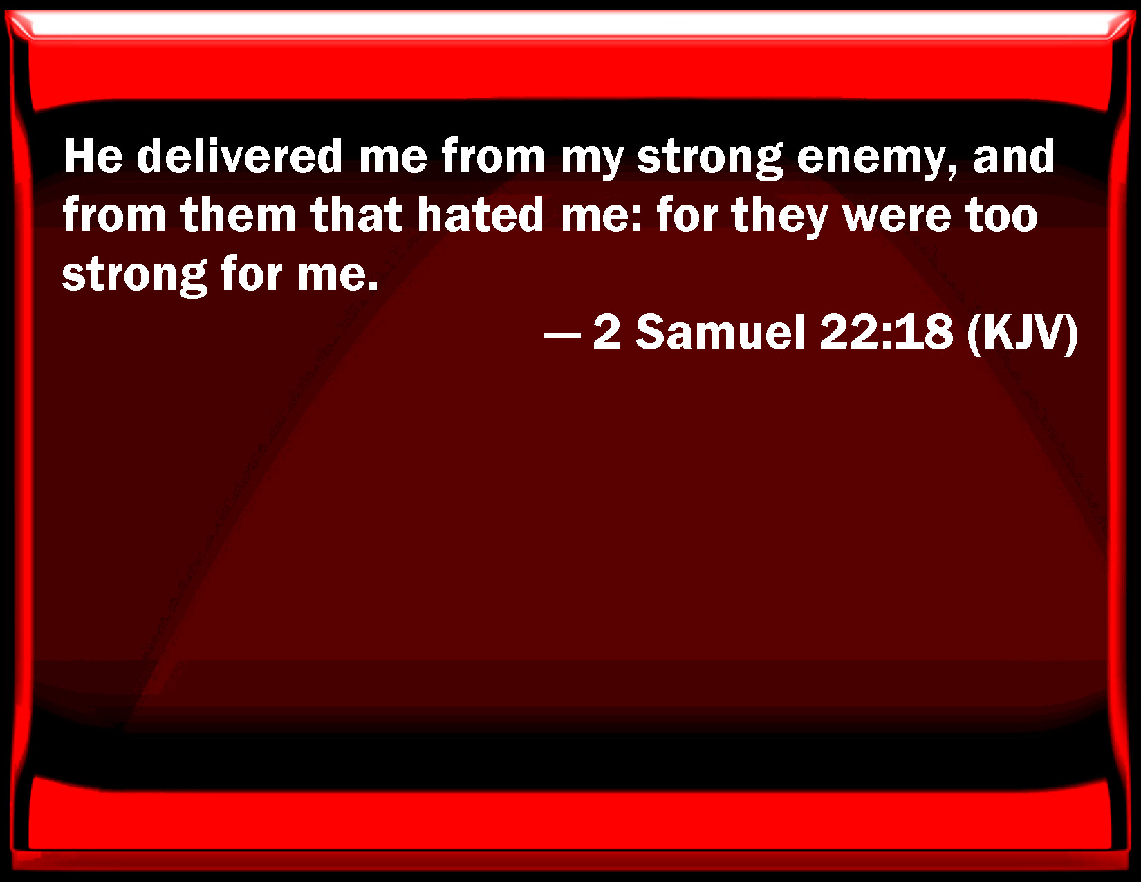 Bible Verse Slide 2 Samuel 22:18 He delivered me from my strong enemy, and from them that hated me: for they were too strong for me. KJV: He delivered me from my strong enemy, and from them that hated me: for they were too strong for me. DRB: He delivered me from my most mighty enemy, and from them that hated me: for they were too strong for me. DBT: He delivered me from my strong enemy, From them that hated me; For they were mightier than I. ERV: He delivered me from my strong enemy, from them that hated me; for they were too mighty for me. WBT: He delivered me from my strong enemy, from them that hated me: for they were too strong for me. WEB: He delivered me from my strong enemy, from those who hated me, for they were too mighty for me. YLT: He delivereth me from my strong enemy, From those hating me, For they were stronger than I.Links 2 Samuel 22:18 NIV • 2 Samuel 22:18 NLT • 2 Samuel 22:18 ESV • 2 Samuel 22:18 NASB • 2 Samuel 22:18 KJV • 2 Samuel 22:18 Interlinear • 2 Samuel 22:18 Commentaries • 2 Samuel 22:18 Parallel Texts • 2 Samuel 22:18 Bible Apps • 2 Samuel 22:18 Parallel • Bible Hub |