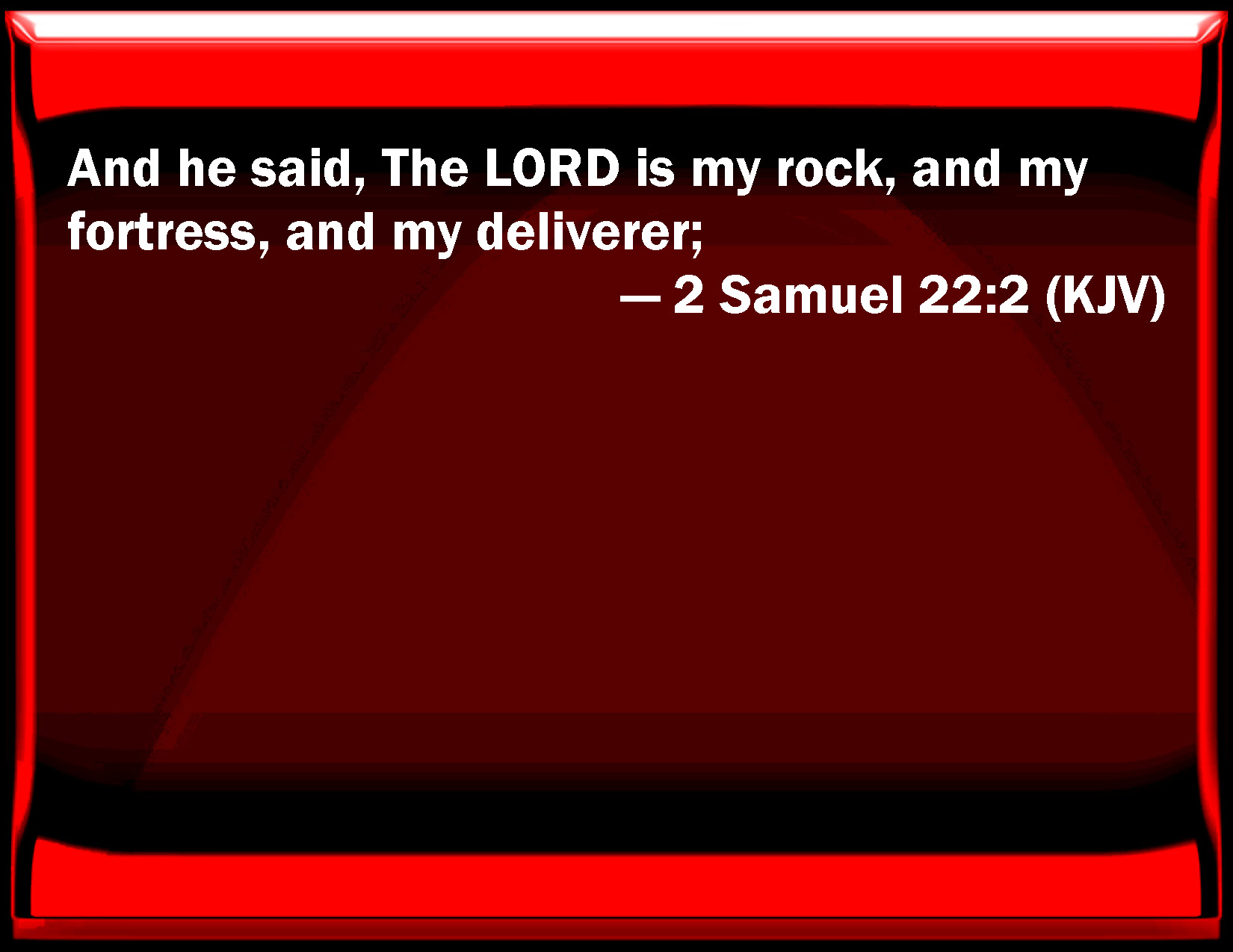 Bible Verse Slide 2 Samuel 22:2 And he said, The LORD is my rock, and my fortress, and my deliverer; KJV: And he said, The LORD is my rock, and my fortress, and my deliverer; DRB: And he said: The Lord is my rock, and my strength, and my saviour. DBT: And he said, Jehovah is my rock, and my fortress, and my deliverer; ERV: and he said, The LORD is my rock, and my fortress, and my deliverer, even mine; WBT: And he said, The LORD is my rock, and my fortress, and my deliverer; WEB: and he said, "Yahweh is my rock, my fortress, and my deliverer, even mine; YLT: and he saith: 'Jehovah is my rock, And my bulwark, and a deliverer to me,Links 2 Samuel 22:2 NIV • 2 Samuel 22:2 NLT • 2 Samuel 22:2 ESV • 2 Samuel 22:2 NASB • 2 Samuel 22:2 KJV • 2 Samuel 22:2 Interlinear • 2 Samuel 22:2 Commentaries • 2 Samuel 22:2 Parallel Texts • 2 Samuel 22:2 Bible Apps • 2 Samuel 22:2 Parallel • Bible Hub |