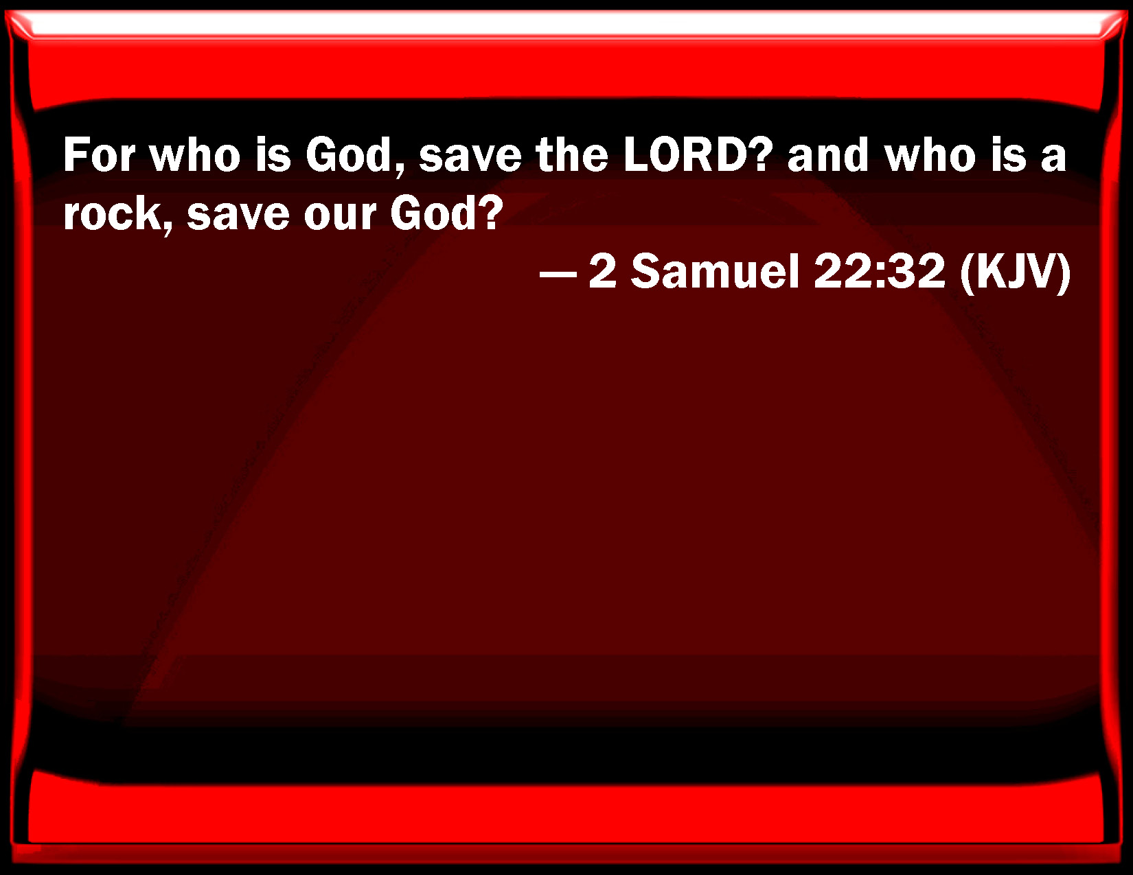 Bible Verse Slide 2 Samuel 22:32 For who is God, save the LORD? and who is a rock, save our God? KJV: For who is God, save the LORD? and who is a rock, save our God? DRB: Who is God but the Lord: and who is strong but our God? DBT: For who is God, save Jehovah? And who is a rock, save our God? ERV: For who is God, save the LORD? and who is a rock, save our God? WBT: For who is God, save the LORD? and who is a rock, save our God? WEB: For who is God, besides Yahweh? Who is a rock, besides our God? YLT: For who is God save Jehovah? And who a Rock save our God?Links 2 Samuel 22:32 NIV • 2 Samuel 22:32 NLT • 2 Samuel 22:32 ESV • 2 Samuel 22:32 NASB • 2 Samuel 22:32 KJV • 2 Samuel 22:32 Interlinear • 2 Samuel 22:32 Commentaries • 2 Samuel 22:32 Parallel Texts • 2 Samuel 22:32 Bible Apps • 2 Samuel 22:32 Parallel • Bible Hub |