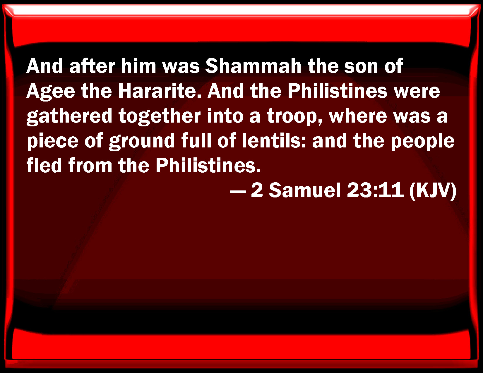 Bible Verse Slide 2 Samuel 23:11 And after him was Shammah the son of Agee the Hararite. And the Philistines were gathered together into a troop, where was a piece of ground full of lentils: and the people fled from the Philistines. KJV: And after him was Shammah the son of Agee the Hararite. And the Philistines were gathered together into a troop, where was a piece of ground full of lentiles: and the people fled from the Philistines. DRB: And after him was Semma the son of Age of Arari. And the Philistines were gathered together in a troop: for there was a field full of lentils. And when the people were fled from the face of the Philistines, DBT: And after him, Shammah the son of Agee the Hararite: the Philistines were gathered into a troop, and there was there a plot of ground full of lentils, and the people had fled before the Philistines; ERV: And after him was Shammah the son of Agce a Hararite. And the Philistines were gathered together into a troop, where was a plot of ground full of lentils; and the people fled from the Philistines. WBT: And after him was Shammah the son of Agee the Hararite. And the Philistines were collected into a troop, where was a piece of ground full of lentils: and the people fled from the Philistines. WEB: After him was Shammah the son of Agee a Hararite. The Philistines were gathered together into a troop, where there was a plot of ground full of lentils; and the people fled from the Philistines. YLT: And after him is Shammah son of Agee the Hararite, and the Philistines are gathered into a company, and there is there a portion of the field full of lentiles, and the people hath fled from the presence of the Philistines,Links 2 Samuel 23:11 NIV • 2 Samuel 23:11 NLT • 2 Samuel 23:11 ESV • 2 Samuel 23:11 NASB • 2 Samuel 23:11 KJV • 2 Samuel 23:11 Interlinear • 2 Samuel 23:11 Commentaries • 2 Samuel 23:11 Parallel Texts • 2 Samuel 23:11 Bible Apps • 2 Samuel 23:11 Parallel • Bible Hub |