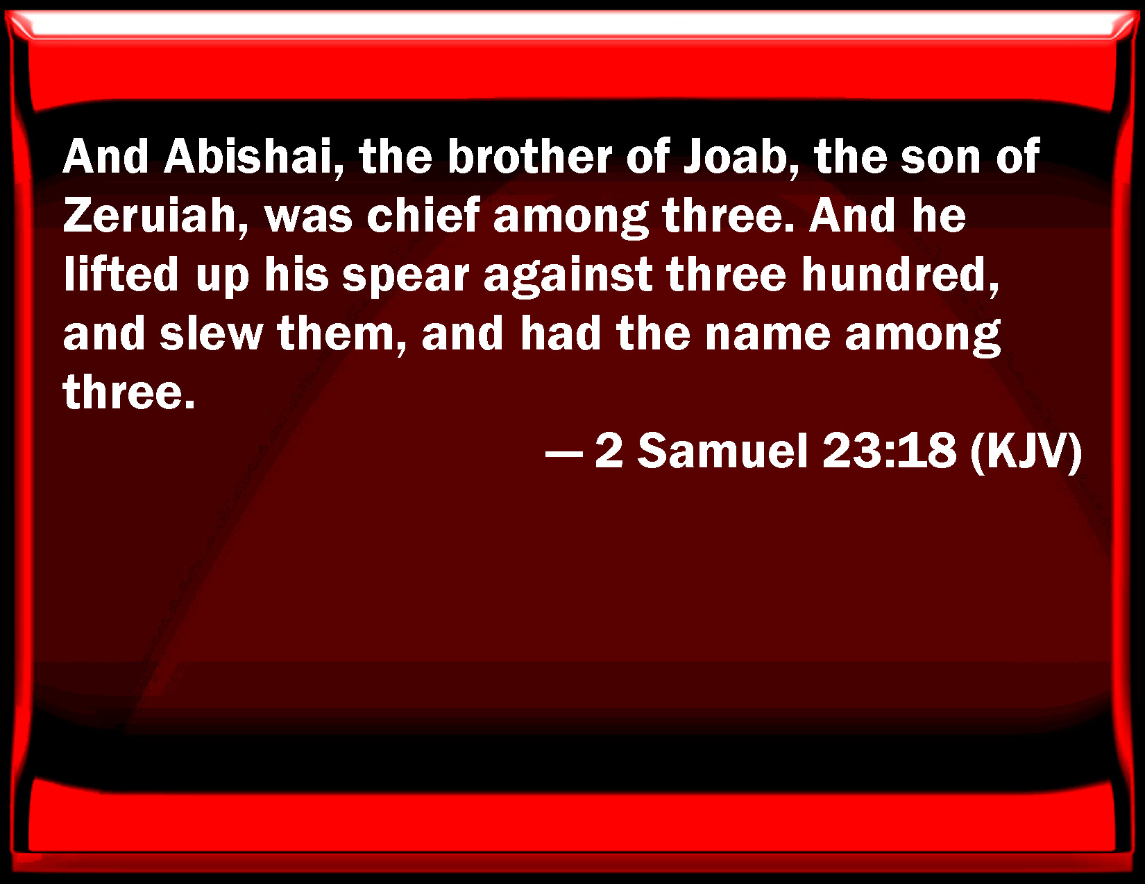 Bible Verse Slide 2 Samuel 23:18 And Abishai, the brother of Joab, the son of Zeruiah, was chief among three. And he lifted up his spear against three hundred, and slew them, and had the name among three. KJV: And Abishai, the brother of Joab, the son of Zeruiah, was chief among three. And he lifted up his spear against three hundred, and slew them, and had the name among three. DRB: Abisai also the brother of Joab, the son of Sarvia, was chief among three: and he lifted up his spear against three hundred whom he slew, and he was renowned among the three, DBT: And Abishai, the brother of Joab, the son of Zeruiah, was the chief of three; and he brandished his spear against three hundred and slew them; and he had a name among the three. ERV: And Abishai, the brother of Joab, the son of Zeruiah, was chief of the three. And he lifted up his spear against three hundred and slew them, and had a name among the three. WBT: And Abishai, the brother of Joab, the son of Zeruiah, was chief among three. And he lifted up his spear against three hundred, and slew them, and had the name among three. WEB: Abishai, the brother of Joab, the son of Zeruiah, was chief of the three. He lifted up his spear against three hundred and killed them, and had a name among the three. YLT: And Abishai brother of Joab, son of Zeruiah, he is head of three, and he is lifting up his spear against three hundred — wounded, and he hath a name among three.Links 2 Samuel 23:18 NIV • 2 Samuel 23:18 NLT • 2 Samuel 23:18 ESV • 2 Samuel 23:18 NASB • 2 Samuel 23:18 KJV • 2 Samuel 23:18 Interlinear • 2 Samuel 23:18 Commentaries • 2 Samuel 23:18 Parallel Texts • 2 Samuel 23:18 Bible Apps • 2 Samuel 23:18 Parallel • Bible Hub |
