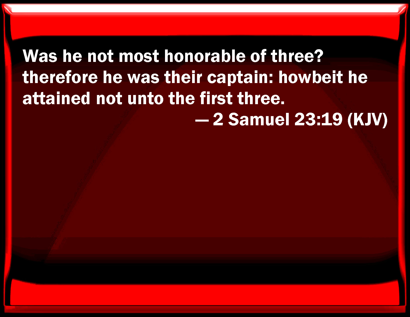 2 Samuel 23:19 Was he not most honorable of three? therefore he was their captain: however, he attained not to the first three.