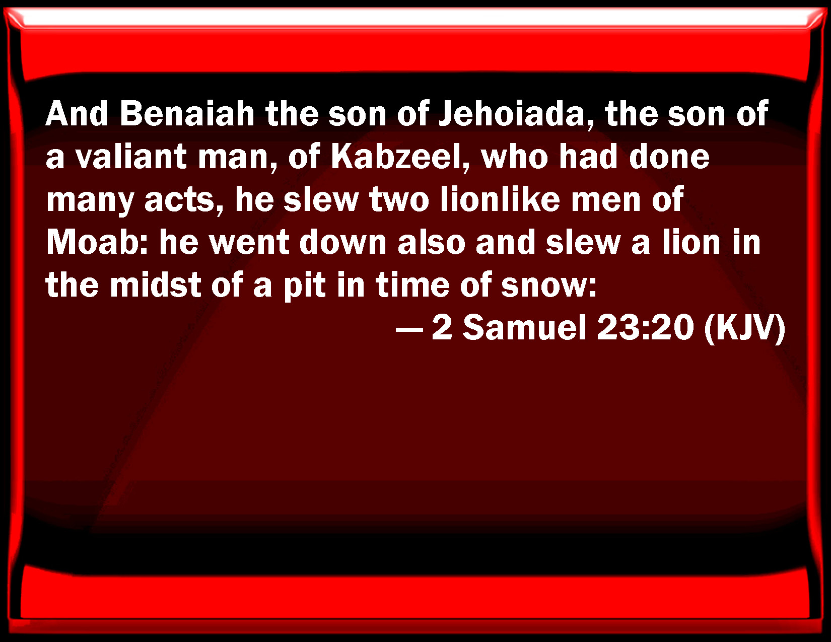 Bible Verse Slide 2 Samuel 23:20 And Benaiah the son of Jehoiada, the son of a valiant man, of Kabzeel, who had done many acts, he slew two lion like men of Moab: he went down also and slew a lion in the middle of a pit in time of snow: KJV: And Benaiah the son of Jehoiada, the son of a valiant man, of Kabzeel, who had done many acts, he slew two lionlike men of Moab: he went down also and slew a lion in the midst of a pit in time of snow: DRB: And Banaias the son of Joiada a most valiant man, of great deeds, of Cabseel: he slew the two lions of Moab, and he went down, and slew a lion in the midst of a pit, in the time of snow. DBT: And Benaiah the son of Jehoiada, son of a valiant man, great in exploits, of Kabzeel: he it was that smote two lions of Moab; and he went down and smote a lion in the midst of a pit on a snowy day. ERV: And Benaiah the son of Jehoiada, the son of a valiant man of Kabzeel, who had done mighty deeds, he slew the two sons of Ariel of Moab: he went down also and slew a lion in the midst of a pit in time of snow: WBT: And Benaiah the son of Jehoiada, the son of a valiant man, of Kabzeel, who had done many acts, he slew two lion-like men of Moab: he went down also and slew a lion in the midst of a pit in time of snow: WEB: Benaiah the son of Jehoiada, the son of a valiant man of Kabzeel, who had done mighty deeds, he killed the two [sons of] Ariel of Moab: he went down also and killed a lion in the midst of a pit in time of snow. YLT: And Benaiah son of Jehoiada (son of a man of valour, great in deeds from Kabzeel), he hath smitten two lion-like men of Moab, and he hath gone down and smitten the lion in the midst of the pit in a day of snow.Links 2 Samuel 23:20 NIV • 2 Samuel 23:20 NLT • 2 Samuel 23:20 ESV • 2 Samuel 23:20 NASB • 2 Samuel 23:20 KJV • 2 Samuel 23:20 Interlinear • 2 Samuel 23:20 Commentaries • 2 Samuel 23:20 Parallel Texts • 2 Samuel 23:20 Bible Apps • 2 Samuel 23:20 Parallel • Bible Hub |