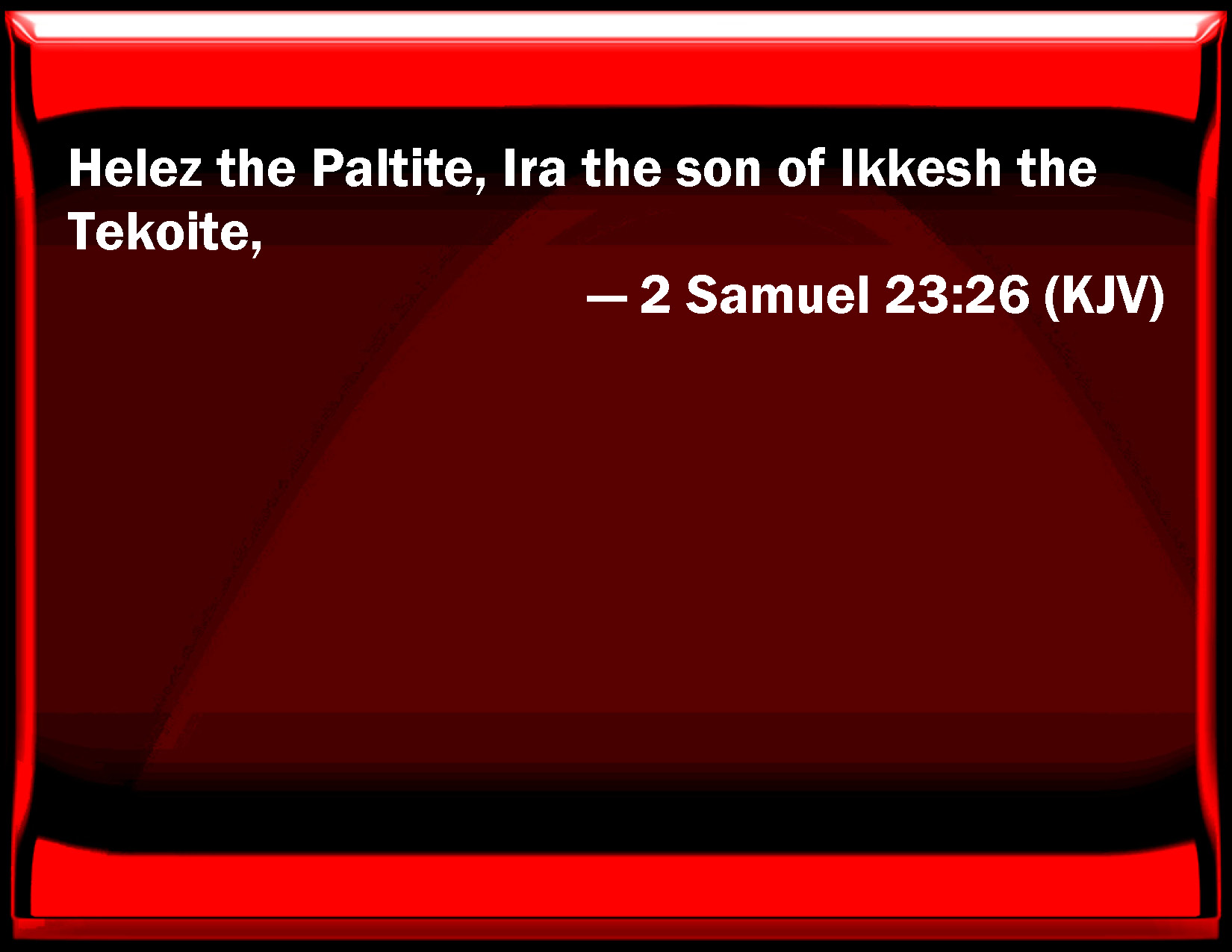 Bible Verse Slide 2 Samuel 23:26 Helez the Paltite, Ira the son of Ikkesh the Tekoite, KJV: Helez the Paltite, Ira the son of Ikkesh the Tekoite, DRB: Heles of Phalti, Hira the son of Acces of Thecua, DBT: Helez the Paltite, Ira the son of Ikkesh the Tekoite, ERV: Helez the Paltite, Ira the son of Ikkesh the Tekoite; WBT: Helez the Paltite, Ira the son of Ikkesh the Tekoite, WEB: Helez the Paltite, Ira the son of Ikkesh the Tekoite, YLT: Helez the Paltite, Ira son of Ikkesh the Tekoite,Links 2 Samuel 23:26 NIV • 2 Samuel 23:26 NLT • 2 Samuel 23:26 ESV • 2 Samuel 23:26 NASB • 2 Samuel 23:26 KJV • 2 Samuel 23:26 Interlinear • 2 Samuel 23:26 Commentaries • 2 Samuel 23:26 Parallel Texts • 2 Samuel 23:26 Bible Apps • 2 Samuel 23:26 Parallel • Bible Hub |
