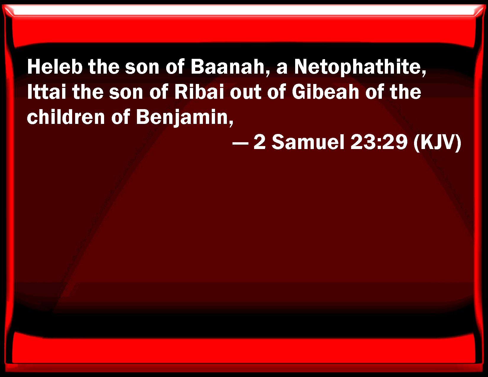 Bible Verse Slide 2 Samuel 23:29 Heleb the son of Baanah, a Netophathite, Ittai the son of Ribai out of Gibeah of the children of Benjamin, KJV: Heleb the son of Baanah, a Netophathite, Ittai the son of Ribai out of Gibeah of the children of Benjamin, DRB: Heled the son of Baana, also a Netophathite, Ithai the son of Ribai of Gabaath of the children of Benjamin, DBT: Heleb the son of Baanah, the Netophathite, Ittai the son of Ribai of Gibeah of the children of Benjamin, ERV: Heleb the son of Baanah the Netophathite, Ittai the son of Ribai of Gibeah of the children of Benjamin; WBT: Heleb the son of Baanah, a Netophathite, Ittai the son of Ribai out of Gibeah of the children of Benjamin, WEB: Heleb the son of Baanah the Netophathite, Ittai the son of Ribai of Gibeah of the children of Benjamin, YLT: Heleb son of Baanah the Netophathite, Ittai son of Ribai from Gibeah of the sons of Benjamin,Links 2 Samuel 23:29 NIV • 2 Samuel 23:29 NLT • 2 Samuel 23:29 ESV • 2 Samuel 23:29 NASB • 2 Samuel 23:29 KJV • 2 Samuel 23:29 Interlinear • 2 Samuel 23:29 Commentaries • 2 Samuel 23:29 Parallel Texts • 2 Samuel 23:29 Bible Apps • 2 Samuel 23:29 Parallel • Bible Hub |
