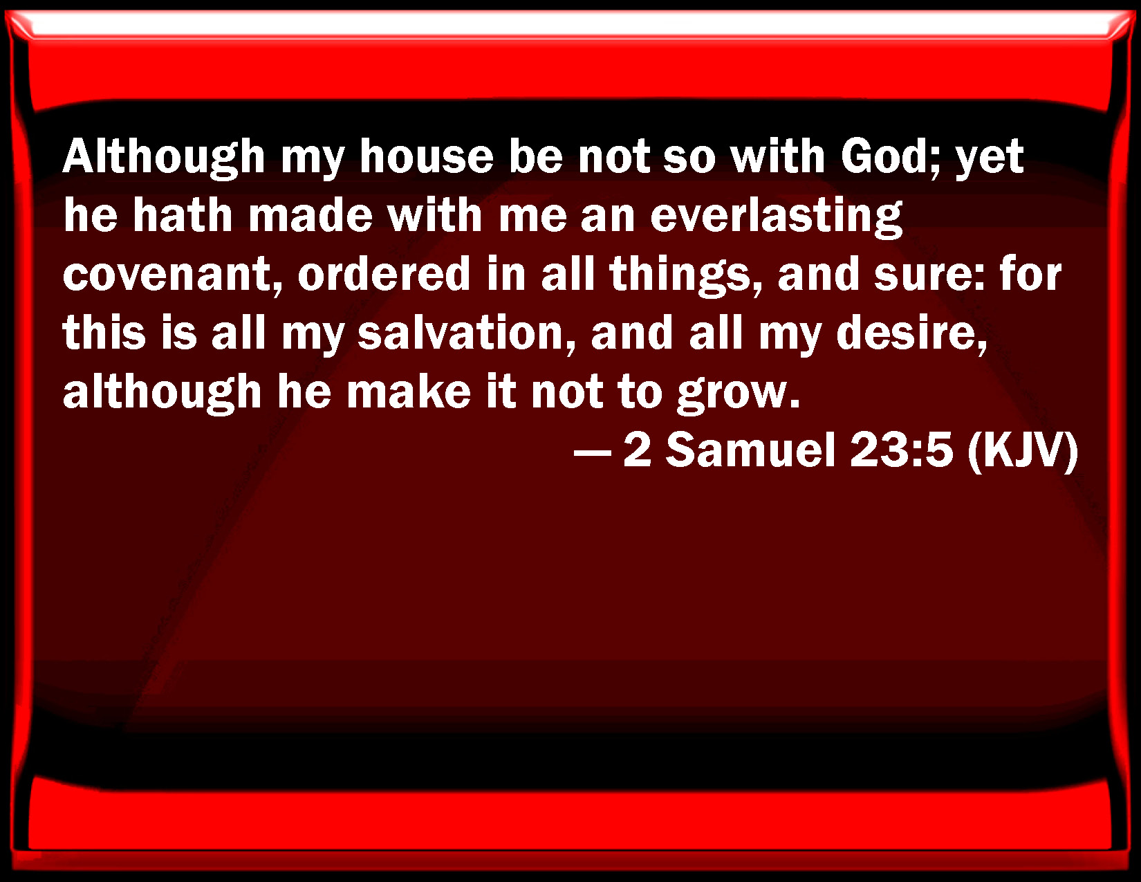 Bible Verse Slide 2 Samuel 23:5 Although my house be not so with God; yet he has made with me an everlasting covenant, ordered in all things, and sure: for this is all my salvation, and all my desire, although he make it not to grow. KJV: Although my house be not so with God; yet he hath made with me an everlasting covenant, ordered in all things, and sure: for this is all my salvation, and all my desire, although he make it not to grow. DRB: Neither is my house so great with God, that he should make with me an eternal covenant, firm in all things and assured. For he is all my salvation, and all my will: neither is there ought thereof that springeth not up. DBT: Although my house be not so before God, Yet he hath made with me an everlasting covenant, Ordered in every way and sure; For this is all my salvation, and every desire, Although he make it not to grow. ERV: Verily my house is not so with God; yet he hath made with me an everlasting covenant, ordered in all things, and sure: for it is all my salvation, and all my desire, although he maketh it not to grow. WBT: Although my house is not so with God; yet he hath made with me an everlasting covenant, ordered in all things, and sure: for this is all my salvation, and all my desire, although he maketh it not to grow. WEB: Most certainly my house is not so with God, yet he has made with me an everlasting covenant, ordered in all things, and sure, for it is all my salvation, and all [my] desire, although he doesn't make it grow. YLT: For — not so is my house with God; For — a covenant age-during He made with me, Arranged in all things, and kept; For — all my salvation, and all desire, For — He hath not caused it to spring up.Links 2 Samuel 23:5 NIV • 2 Samuel 23:5 NLT • 2 Samuel 23:5 ESV • 2 Samuel 23:5 NASB • 2 Samuel 23:5 KJV • 2 Samuel 23:5 Interlinear • 2 Samuel 23:5 Commentaries • 2 Samuel 23:5 Parallel Texts • 2 Samuel 23:5 Bible Apps • 2 Samuel 23:5 Parallel • Bible Hub |
