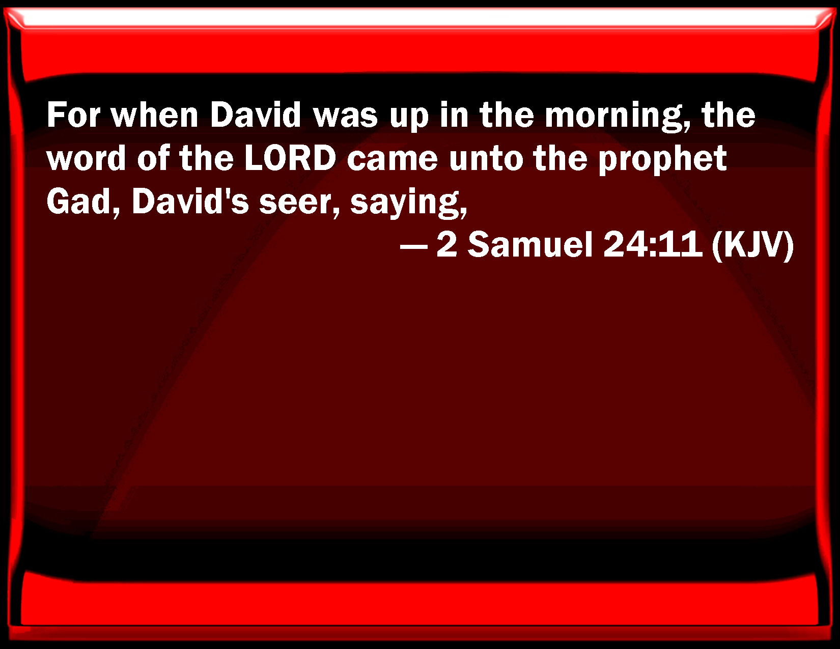 Bible Verse Slide 2 Samuel 24:11 For when David was up in the morning, the word of the LORD came to the prophet Gad, David's seer, saying, KJV: For when David was up in the morning, the word of the LORD came unto the prophet Gad, David's seer, saying, DRB: And David arose in the morning, and the word of the Lord came to Gad the prophet and the seer of David, saying: DBT: And when David arose in the morning, the word of Jehovah came to the prophet Gad, David's seer, saying, ERV: And when David rose up in the morning, the word of the LORD came unto the prophet Gad, David's seer, saying, WBT: For when David had risen in the morning, the word of the LORD came to the prophet Gad, David's seer, saying, WEB: When David rose up in the morning, the word of Yahweh came to the prophet Gad, David's seer, saying, YLT: And David riseth in the morning, and the word of Jehovah hath been unto Gad the prophet, seer of David, saying,Links 2 Samuel 24:11 NIV • 2 Samuel 24:11 NLT • 2 Samuel 24:11 ESV • 2 Samuel 24:11 NASB • 2 Samuel 24:11 KJV • 2 Samuel 24:11 Interlinear • 2 Samuel 24:11 Commentaries • 2 Samuel 24:11 Parallel Texts • 2 Samuel 24:11 Bible Apps • 2 Samuel 24:11 Parallel • Bible Hub |