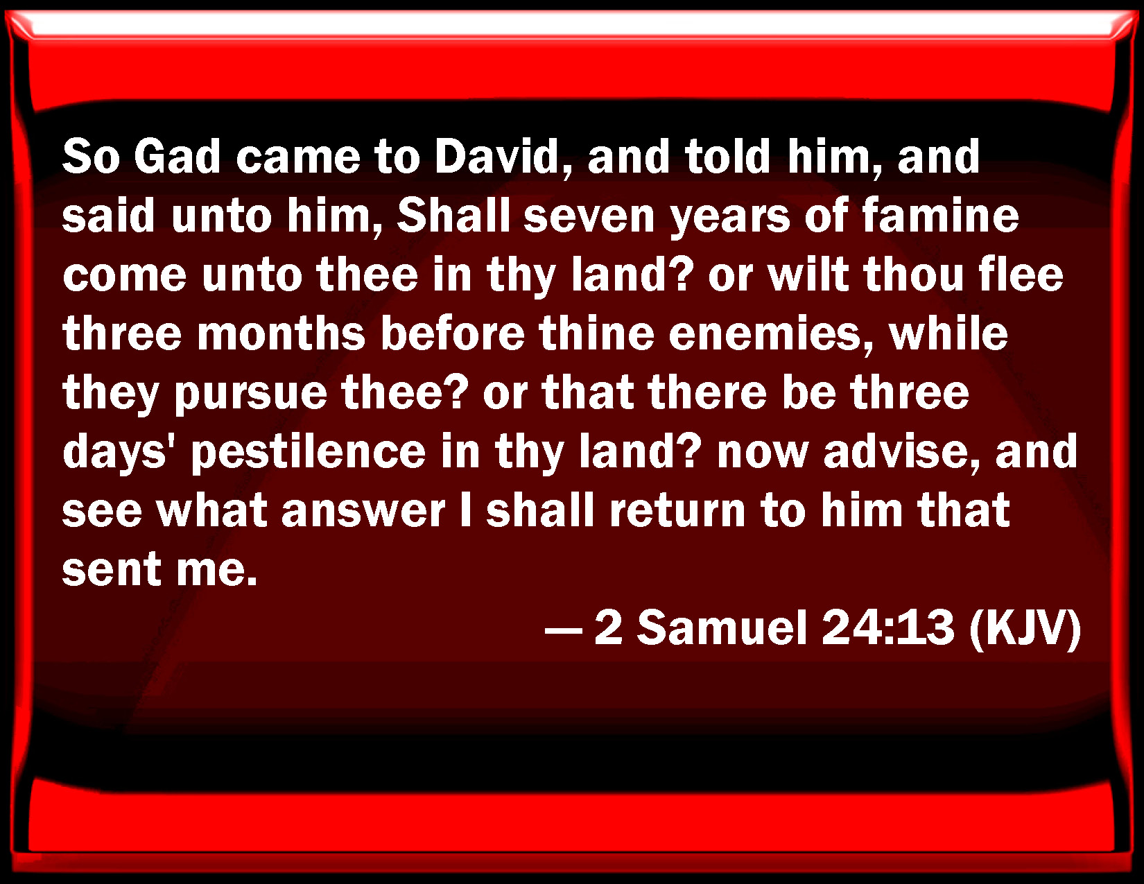 So Gad came to David, and told him, and said unto him, Shall seven years of famine come unto thee in thy land? or wilt thou flee three months before thine enemies, while they pursue thee? or that there be three days' pestilence in thy land? now advise, and see what answer I shall return to him that sent me.