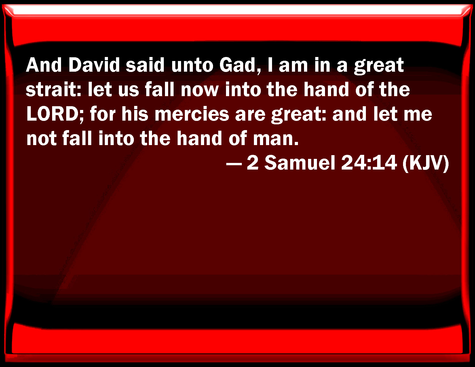 Bible Verse Slide 2 Samuel 24:14 And David said to Gad, I am in a great strait: let us fall now into the hand of the LORD; for his mercies are great: and let me not fall into the hand of man. KJV: And David said unto Gad, I am in a great strait: let us fall now into the hand of the LORD; for his mercies are great: and let me not fall into the hand of man. DRB: And David said to Gad: I am in a great strait: but it is better that I should fall into the hands of the Lord (for his mercies are many) than into the hands of men. DBT: And David said to Gad, I am in a great strait: let us fall, I pray thee, into the hand of Jehovah; for his mercies are great; but let me not fall into the hand of man. ERV: And David said unto Gad, I am in a great strait: let us fall now into the hand of the LORD; for his mercies are great: and let me not fall into the hand of man. WBT: And David said to Gad, I am in a great strait: let us fall now into the hand of the LORD; for his mercies are great: and let me not fall into the hand of man. WEB: David said to Gad, "I am in distress. Let us fall now into the hand of Yahweh; for his mercies are great. Let me not fall into the hand of man." YLT: And David saith unto Gad, 'I have great distress, let us fall, I pray thee, into the hand of Jehovah, for many are His mercies, and into the hand of man let me not fall.'Links 2 Samuel 24:14 NIV • 2 Samuel 24:14 NLT • 2 Samuel 24:14 ESV • 2 Samuel 24:14 NASB • 2 Samuel 24:14 KJV • 2 Samuel 24:14 Interlinear • 2 Samuel 24:14 Commentaries • 2 Samuel 24:14 Parallel Texts • 2 Samuel 24:14 Bible Apps • 2 Samuel 24:14 Parallel • Bible Hub |