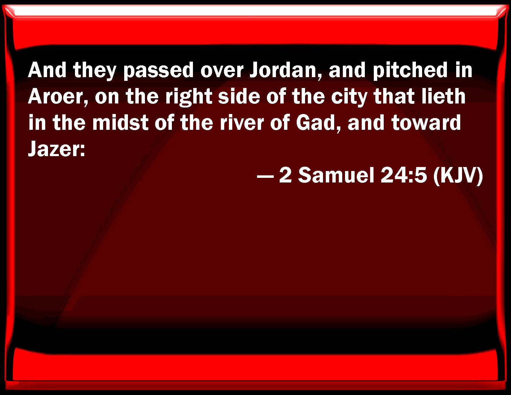 Bible Verse Slide 2 Samuel 24:5 And they passed over Jordan, and pitched in Aroer, on the right side of the city that lies in the middle of the river of Gad, and toward Jazer: KJV: And they passed over Jordan, and pitched in Aroer, on the right side of the city that lieth in the midst of the river of Gad, and toward Jazer: DRB: And when they had passed the Jordan, they came to Aroer to the right side of the city, which is in the vale of Gad. DBT: And they passed over the Jordan, and encamped in Aroer, on the right side of the city that is in the midst of the ravine of Gad, and toward Jaazer. ERV: And they passed over Jordan, and pitched in Aroer, on the right side of the city that is in the middle of the valley of Gad, and unto Jazer. WBT: And they passed over Jordan, and pitched in Aroer, on the right side of the city that lieth in the midst of the river of Gad, and towards Jazer: WEB: They passed over the Jordan, and encamped in Aroer, on the right side of the city that is in the middle of the valley of Gad, and to Jazer: YLT: and they pass over the Jordan, and encamp in Aroer, on the right of the city that is in the midst of the brook of Gad, and unto Jazer,Links 2 Samuel 24:5 NIV • 2 Samuel 24:5 NLT • 2 Samuel 24:5 ESV • 2 Samuel 24:5 NASB • 2 Samuel 24:5 KJV • 2 Samuel 24:5 Interlinear • 2 Samuel 24:5 Commentaries • 2 Samuel 24:5 Parallel Texts • 2 Samuel 24:5 Bible Apps • 2 Samuel 24:5 Parallel • Bible Hub |