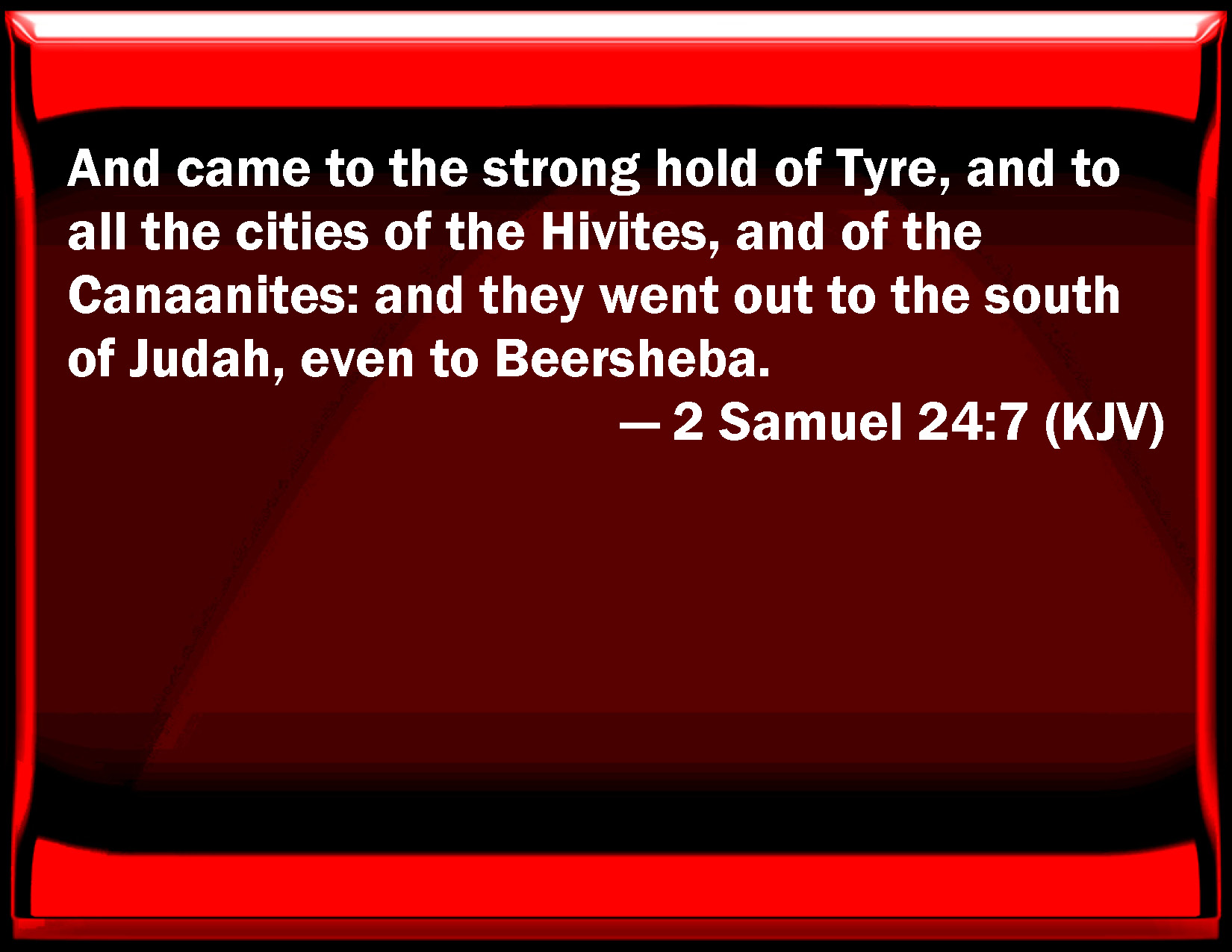 Bible Verse Slide 2 Samuel 24:7 And came to the strong hold of Tyre, and to all the cities of the Hivites, and of the Canaanites: and they went out to the south of Judah, even to Beersheba. KJV: And came to the strong hold of Tyre, and to all the cities of the Hivites, and of the Canaanites: and they went out to the south of Judah, even to Beersheba. DRB: They passed near the walls of Tyre, and all the land of the Hevite, and the Chanaanite, and they came to the south of Juda into Bersabee: DBT: and they came to the fortified city of Tyre, and to all the cities of the Hivites and of the Canaanites; and went out to the south of Judah, to Beer-sheba. ERV: and came to the strong hold of Tyre, and to all the cities of the Hivites, and of the Canaanites: and they went out to the south of Judah, at Beer-sheba. WBT: And came to the strong hold of Tyre, and to all the cities of the Hivites, and of the Canaanites: and they went out to the south of Judah, even to Beer-sheba. WEB: and came to the stronghold of Tyre, and to all the cities of the Hivites, and of the Canaanites; and they went out to the south of Judah, at Beersheba. YLT: and they come in to the fortress of Tyre, and all the cities of the Hivite, and of the Canaanite, and go out unto the south of Judah, to Beer-Sheba.Links 2 Samuel 24:7 NIV • 2 Samuel 24:7 NLT • 2 Samuel 24:7 ESV • 2 Samuel 24:7 NASB • 2 Samuel 24:7 KJV • 2 Samuel 24:7 Interlinear • 2 Samuel 24:7 Commentaries • 2 Samuel 24:7 Parallel Texts • 2 Samuel 24:7 Bible Apps • 2 Samuel 24:7 Parallel • Bible Hub |