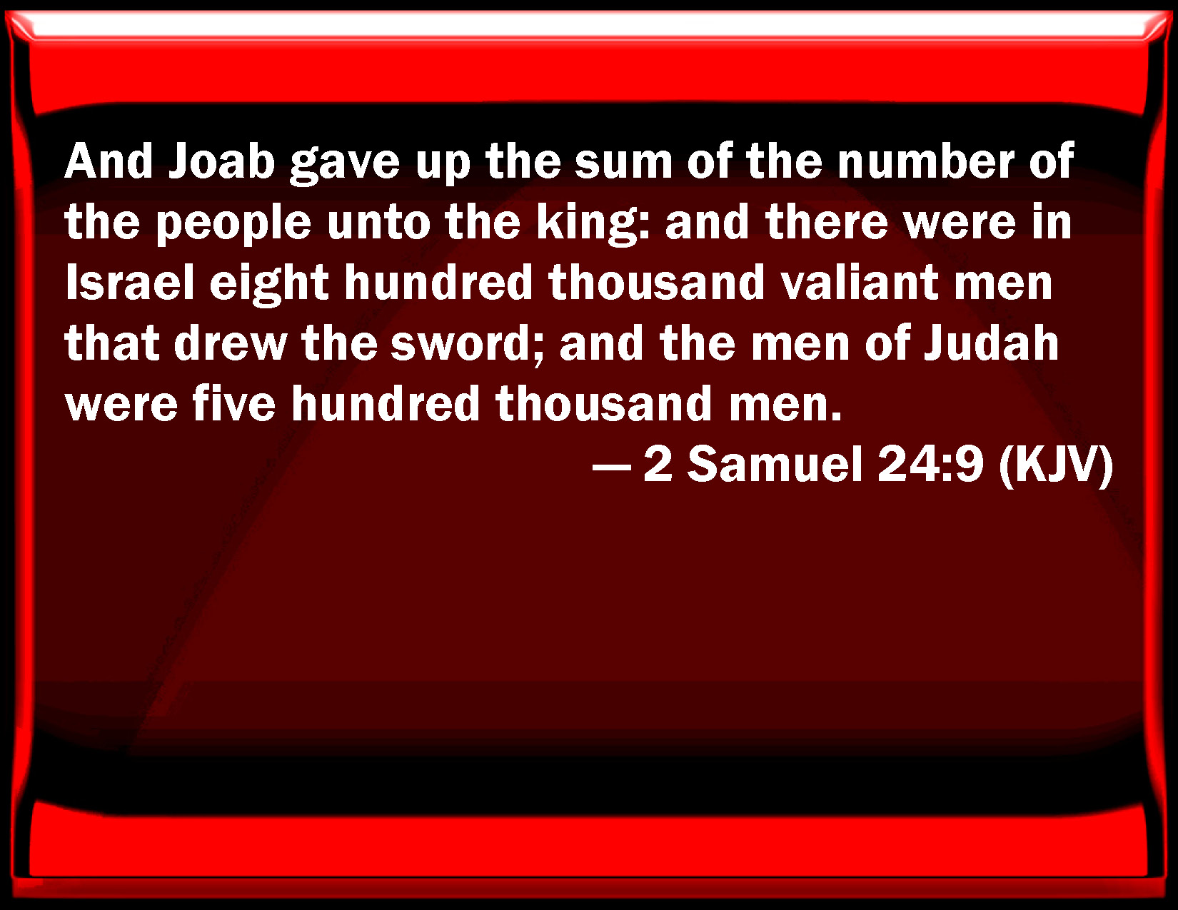 2 Samuel 24:9 And Joab gave up the sum of the number of the people to the king: and there were in Israel eight hundred thousand valiant men that drew the sword; and the men of Judah were five hundred thousand men.
