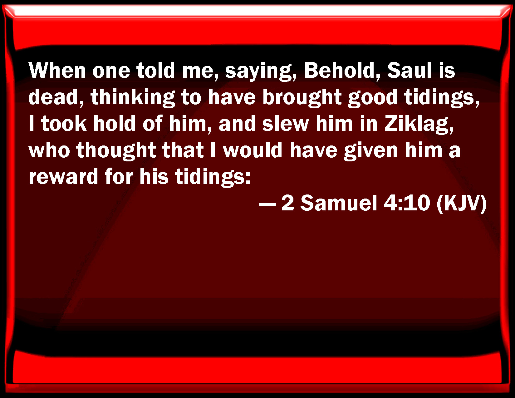 Bible Verse Slide 2 Samuel 4:10 When one told me, saying, Behold, Saul is dead, thinking to have brought good tidings, I took hold of him, and slew him in Ziklag, who thought that I would have given him a reward for his tidings: KJV: When one told me, saying, Behold, Saul is dead, thinking to have brought good tidings, I took hold of him, and slew him in Ziklag, who thought that I would have given him a reward for his tidings: DRB: The man that told me, and said: Saul is dead, who thought he brought good tidings, I apprehended, and slew him in Siceleg, who should have been rewarded for his news. DBT: when one told me, saying, Behold, Saul is dead! and he was in his own sight a messenger of good, I took hold of him, and slew him in Ziklag to whom forsooth I should give a reward for his good tidings: ERV: when one told me, saying, Behold, Saul is dead, thinking to have brought good tidings, I took hold of him, and slew him in Ziklag, which was the reward I gave him for his tidings. WBT: When one told me, saying, Behold, Saul is dead, (thinking to have brought good tidings,) I took hold of him, and slew him in Ziklag, who thought that I would have given him a reward for his tidings: WEB: when someone told me, 'Behold, Saul is dead,' thinking to have brought good news, I took hold of him, and killed him in Ziklag, which was the reward I gave him for his news. YLT: when one is declaring to me, saying, Lo, Saul is dead, and he was as a bearer of tidings in his own eyes, then I take hold on him, and slay him in Ziklag, instead of my giving to him for the tidings.Links 2 Samuel 4:10 NIV • 2 Samuel 4:10 NLT • 2 Samuel 4:10 ESV • 2 Samuel 4:10 NASB • 2 Samuel 4:10 KJV • 2 Samuel 4:10 Interlinear • 2 Samuel 4:10 Commentaries • 2 Samuel 4:10 Parallel Texts • 2 Samuel 4:10 Bible Apps • 2 Samuel 4:10 Parallel • Bible Hub |