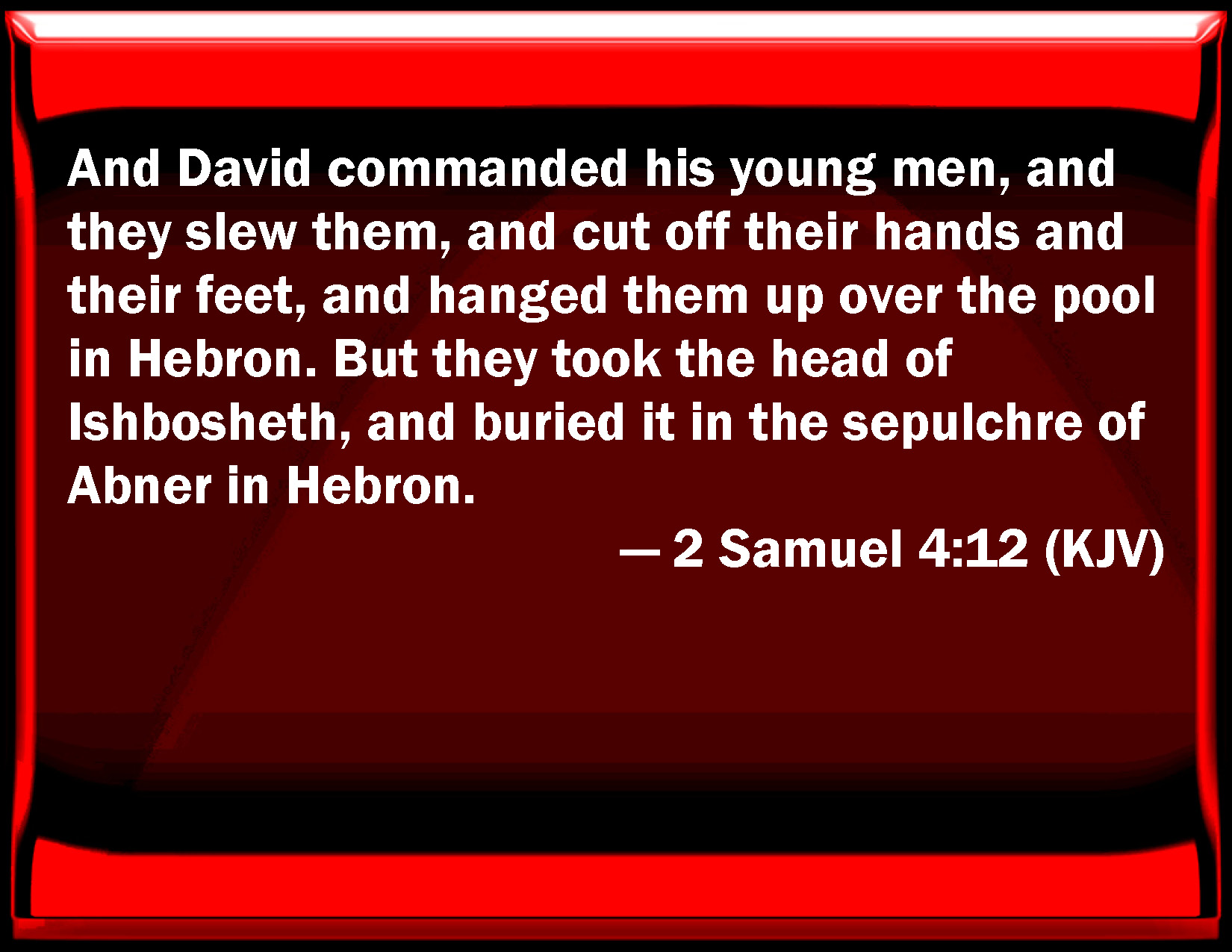 DBT:  And David commanded his young men, and they slew them, and cut off their hands and their feet, and hanged them up over the pool in Hebron. But they took the head of Ishbosheth, and buried it in the sepulchre of Abner in Hebron.