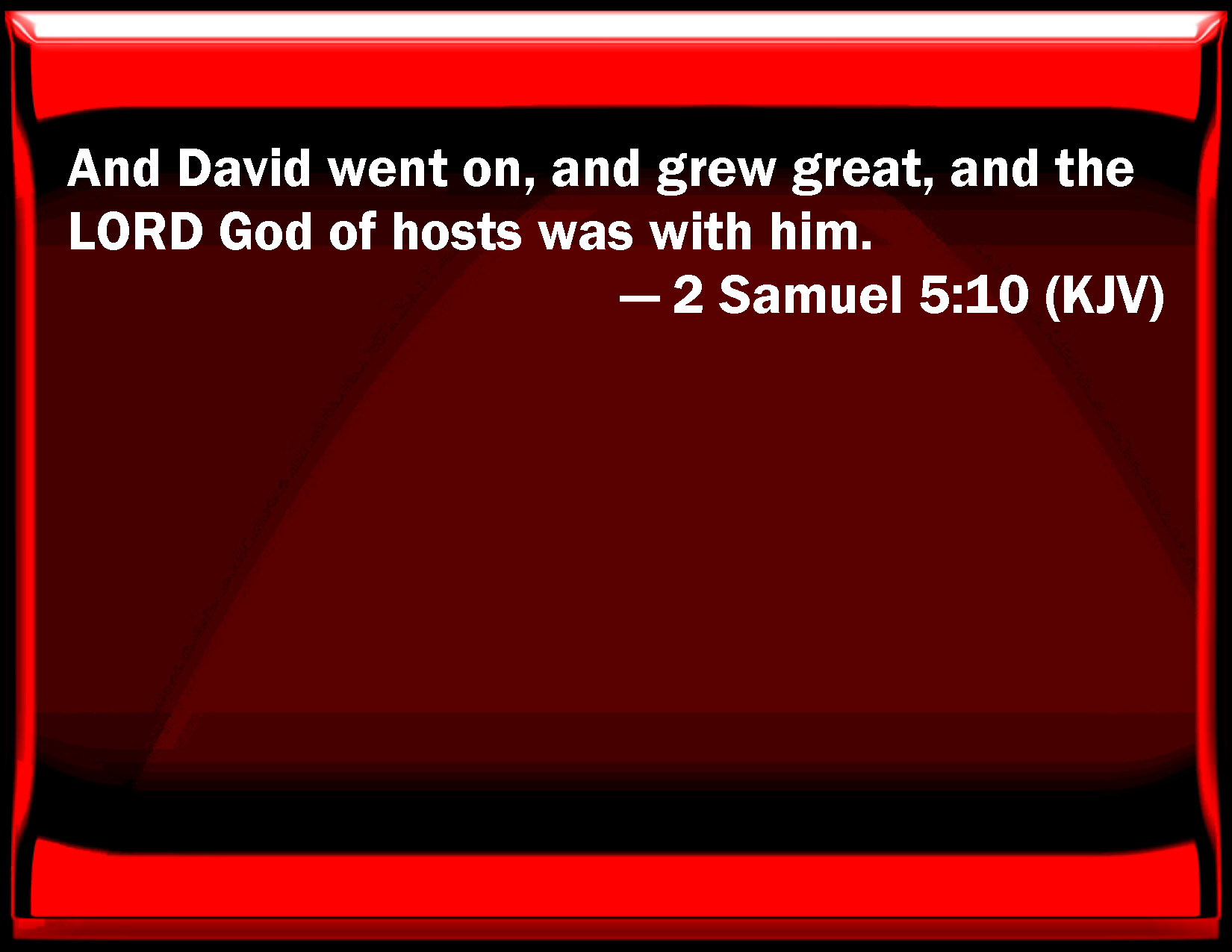 Bible Verse Slide 2 Samuel 5:10 And David went on, and grew great, and the LORD God of hosts was with him. KJV: And David went on, and grew great, and the LORD God of hosts was with him. DRB: And he went on prospering and growing up, and the Lord God of hosts was with him. DBT: And David became continually greater; and Jehovah the God of hosts was with him. ERV: And David waxed greater and greater; for the LORD, the God of hosts, was with him. WBT: And David went on, and grew great, and the LORD God of hosts was with him. WEB: David grew greater and greater; for Yahweh, the God of Armies, was with him. YLT: and David goeth, going on and becoming great, and Jehovah, God of Hosts, is with him.Links 2 Samuel 5:10 NIV • 2 Samuel 5:10 NLT • 2 Samuel 5:10 ESV • 2 Samuel 5:10 NASB • 2 Samuel 5:10 KJV • 2 Samuel 5:10 Interlinear • 2 Samuel 5:10 Commentaries • 2 Samuel 5:10 Parallel Texts • 2 Samuel 5:10 Bible Apps • 2 Samuel 5:10 Parallel • Bible Hub |