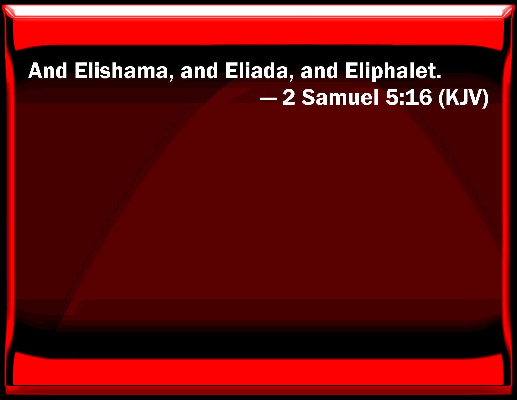 Bible Verse Slide 2 Samuel 5:16 And Elishama, and Eliada, and Eliphalet. KJV: And Elishama, and Eliada, and Eliphalet. DRB: And Japhia, and Elisama, and Elioda, and Eliphaleth. DBT: and Elishama, and Eliada, and Eliphelet. ERV: and Elishama, and Eliada, and Eliphelet. WBT: And Elishama, and Eliada, and Eliphalet. WEB: and Elishama, and Eliada, and Eliphelet. YLT: and Elishama, and Eliada, and Eliphalet.Links 2 Samuel 5:16 NIV • 2 Samuel 5:16 NLT • 2 Samuel 5:16 ESV • 2 Samuel 5:16 NASB • 2 Samuel 5:16 KJV • 2 Samuel 5:16 Interlinear • 2 Samuel 5:16 Commentaries • 2 Samuel 5:16 Parallel Texts • 2 Samuel 5:16 Bible Apps • 2 Samuel 5:16 Parallel • Bible Hub |