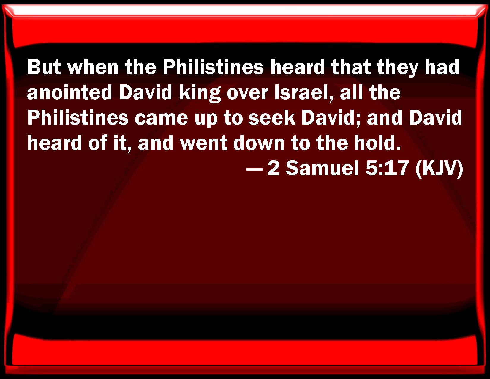 Bible Verse Slide 2 Samuel 5:17 But when the Philistines heard that they had anointed David king over Israel, all the Philistines came up to seek David; and David heard of it, and went down to the hold. KJV: But when the Philistines heard that they had anointed David king over Israel, all the Philistines came up to seek David; and David heard of it, and went down to the hold. DRB: And the Philistines heard that they had anointed David to be king over Israel: and they all came to seek David: and when David heard of it, he went down to a strong hold. DBT: And the Philistines heard that they had anointed David king over Israel, and all the Philistines went up to seek David; and David heard of it, and went down to the stronghold. ERV: And when the Philistines heard that they had anointed David king over Israel, all the Philistines went up to seek David; and David heard of it, and went down to the hold. WBT: But when the Philistines heard that they had anointed David king over Israel, all the Philistines came up to seek David; and David heard of it, and went down to the hold. WEB: When the Philistines heard that they had anointed David king over Israel, all the Philistines went up to seek David; and David heard of it, and went down to the stronghold. YLT: And the Philistines hear that they have anointed David for king over Israel, and all the Philistines come up to seek David, and David heareth, and goeth down unto the fortress,Links 2 Samuel 5:17 NIV • 2 Samuel 5:17 NLT • 2 Samuel 5:17 ESV • 2 Samuel 5:17 NASB • 2 Samuel 5:17 KJV • 2 Samuel 5:17 Interlinear • 2 Samuel 5:17 Commentaries • 2 Samuel 5:17 Parallel Texts • 2 Samuel 5:17 Bible Apps • 2 Samuel 5:17 Parallel • Bible Hub |