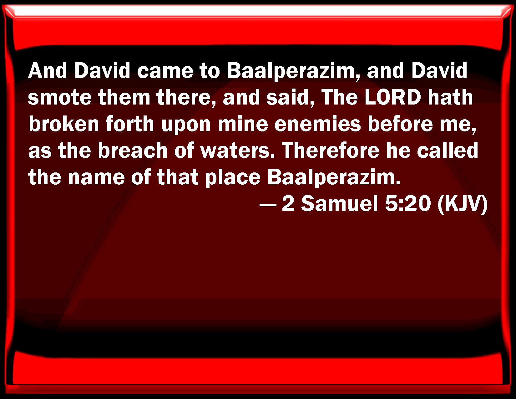 Bible Verse Slide 2 Samuel 5:20 And David came to Baalperazim, and David smote them there, and said, The LORD has broken forth on my enemies before me, as the breach of waters. Therefore he called the name of that place Baalperazim. KJV: And David came to Baalperazim, and David smote them there, and said, The LORD hath broken forth upon mine enemies before me, as the breach of waters. Therefore he called the name of that place Baalperazim. DRB: And David came to Baal Pharisim: and defeated them there, and he said: The Lord hath divided my enemies before me, as waters are divided. Therefore the name of the place was called Baal Pharisim. DBT: And David came to Baal-perazim, and David smote them there; and he said, Jehovah has broken in upon mine enemies before me, as the breaking forth of waters. Therefore he called the name of that place Baal-perazim. ERV: And David came to Baal-perazim, and David smote them there; and he said, The LORD hath broken mine enemies before me, like the breach of waters. Therefore he called the name of that place Baal-perazim. WBT: And David came to Baal-perazim, and David smote them there, and said, The LORD hath broken forth upon my enemies before me, as the breach of waters. Therefore he called the name of that place Baal-perazim. WEB: David came to Baal Perazim, and David struck them there; and he said, "Yahweh has broken my enemies before me, like the breach of waters." Therefore he called the name of that place Baal Perazim. YLT: And David cometh in to Baal-Perazim, and David smiteth them there, and saith, 'Jehovah hath broken forth on mine enemies before me, as the breaking forth of waters;' therefore he hath called the name of that place Baal-Perazim.Links 2 Samuel 5:20 NIV • 2 Samuel 5:20 NLT • 2 Samuel 5:20 ESV • 2 Samuel 5:20 NASB • 2 Samuel 5:20 KJV • 2 Samuel 5:20 Interlinear • 2 Samuel 5:20 Commentaries • 2 Samuel 5:20 Parallel Texts • 2 Samuel 5:20 Bible Apps • 2 Samuel 5:20 Parallel • Bible Hub |