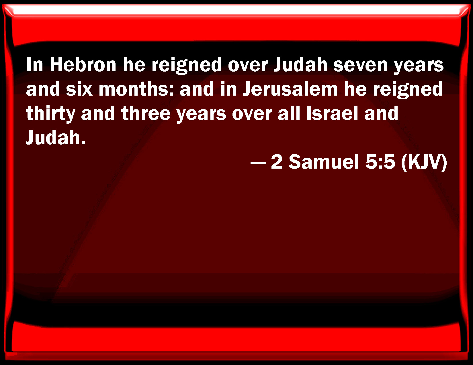 2 Samuel 5:5 In Hebron he reigned over Judah seven years and six months: and in Jerusalem he reigned thirty and three years over all Israel and Judah.