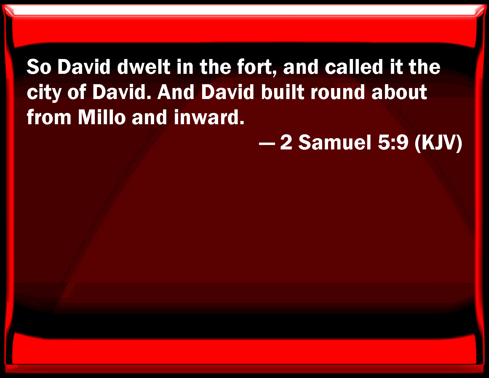 Bible Verse Slide 2 Samuel 5:9 So David dwelled in the fort, and called it the city of David. And David built round about from Millo and inward. KJV: So David dwelt in the fort, and called it the city of David. And David built round about from Millo and inward. DRB: And David dwelt in the castle, and called it, The city of David: and built round about from Mello and inwards. DBT: So David dwelt in the stronghold, and called it the city of David. And David built round about from the Millo and inward. ERV: And David dwelt in the strong hold, and called it the city of David. And David built round about from Millo and inward. WBT: So David dwelt in the fort, and called it the city of David. And David built around from Millo and inward. WEB: David lived in the stronghold, and called it the city of David. David built around from Millo and inward. YLT: And David dwelleth in the fortress, and calleth it — City of David, and David buildeth round about, from Millo and inward,Links 2 Samuel 5:9 NIV • 2 Samuel 5:9 NLT • 2 Samuel 5:9 ESV • 2 Samuel 5:9 NASB • 2 Samuel 5:9 KJV • 2 Samuel 5:9 Interlinear • 2 Samuel 5:9 Commentaries • 2 Samuel 5:9 Parallel Texts • 2 Samuel 5:9 Bible Apps • 2 Samuel 5:9 Parallel • Bible Hub |
