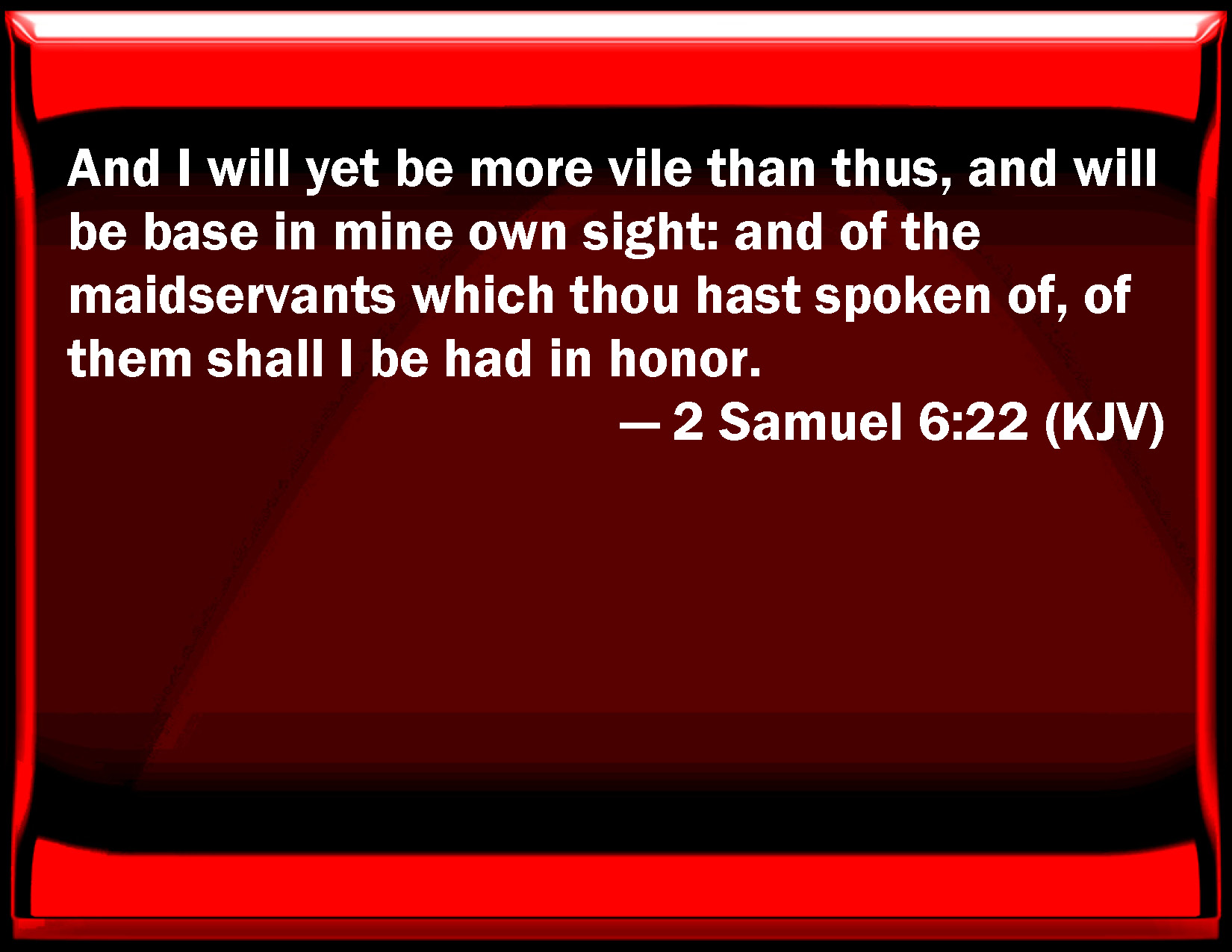 Bible Verse Slide 2 Samuel 6:22 And I will yet be more vile than thus, and will be base in my own sight: and of the maidservants which you have spoken of, of them shall I be had in honor. KJV: And I will yet be more vile than thus, and will be base in mine own sight: and of the maidservants which thou hast spoken of, of them shall I be had in honour. DRB: I will both play and make myself meaner than I have done: and I will be little in my own eyes: and with the handmaid of whom thou speakest, I shall appear more glorious. DBT: And I will make myself yet more vile than thus, and will be base in mine own sight; and of the handmaids that thou hast spoken of, of them shall I be had in honour. ERV: And I will be yet more vile than thus, and will be base in mine own sight: but of the handmaids which thou hast spoken of, of them shall I be had in honour. WBT: And I shall yet be more vile than thus, and shall be base in my own sight: and by the maid-servants which thou hast spoken of, by them shall I be had in honor. WEB: I will be yet more vile than this, and will be base in my own sight. But of the handmaids of whom you have spoken, they shall honor me." YLT: and I have been more vile than this, and have been low in mine eyes, and with the handmaids whom thou hast spoken of, with them I am honoured.'Links 2 Samuel 6:22 NIV • 2 Samuel 6:22 NLT • 2 Samuel 6:22 ESV • 2 Samuel 6:22 NASB • 2 Samuel 6:22 KJV • 2 Samuel 6:22 Interlinear • 2 Samuel 6:22 Commentaries • 2 Samuel 6:22 Parallel Texts • 2 Samuel 6:22 Bible Apps • 2 Samuel 6:22 Parallel • Bible Hub |