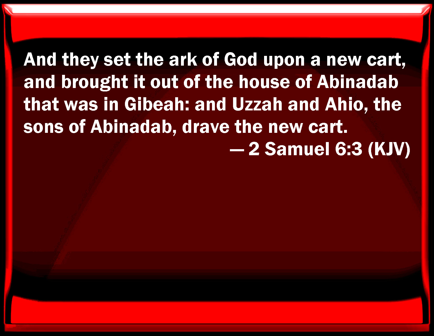 Bible Verse Slide 2 Samuel 6:3 And they set the ark of God on a new cart, and brought it out of the house of Abinadab that was in Gibeah: and Uzzah and Ahio, the sons of Abinadab, drove the new cart. KJV: And they set the ark of God upon a new cart, and brought it out of the house of Abinadab that was in Gibeah: and Uzzah and Ahio, the sons of Abinadab, drave the new cart. DRB: And they laid the ark of God upon a new cart: and took it out of the house of Abinadab, who was in Gabaa: and Oza, and Ahio, the sons of Abinadab, drove the new cart. DBT: And they set the ark of God upon a new cart, and brought it out of the house of Abinadab, which was upon the hill; and Uzzah and Ahio, the sons of Abinadab, drove the new cart. ERV: And they set the ark of God upon a new cart, and brought it out of the house of Abinadab that was in the hill: and Uzzah and Ahio, the sons of Abinadab, drave the new cart. WBT: And they set the ark of God upon a new cart, and brought it out of the house of Abinadab that was in Gibeah: and Uzzah and Ahio the sons of Abinadab drove the new cart. WEB: They set the ark of God on a new cart, and brought it out of the house of Abinadab that was in the hill: and Uzzah and Ahio, the sons of Abinadab, drove the new cart. YLT: And they cause the ark of God to ride on a new cart, and lift it up from the house of Abinadab, which is in the height, and Uzzah and Ahio sons of Abinadab are leading the new cart;Links 2 Samuel 6:3 NIV • 2 Samuel 6:3 NLT • 2 Samuel 6:3 ESV • 2 Samuel 6:3 NASB • 2 Samuel 6:3 KJV • 2 Samuel 6:3 Interlinear • 2 Samuel 6:3 Commentaries • 2 Samuel 6:3 Parallel Texts • 2 Samuel 6:3 Bible Apps • 2 Samuel 6:3 Parallel • Bible Hub |