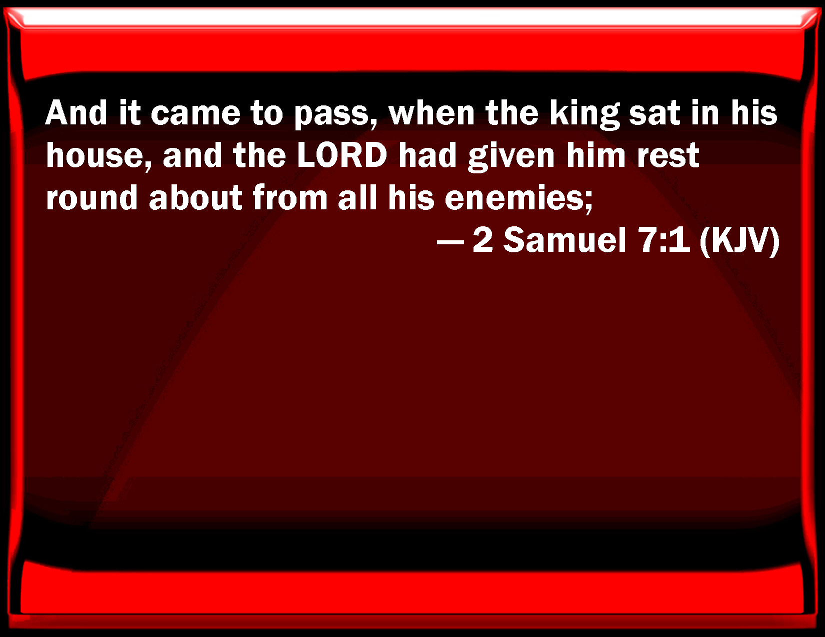 Bible Verse Slide 2 Samuel 7:1 And it came to pass, when the king sat in his house, and the LORD had given him rest round about from all his enemies; KJV: And it came to pass, when the king sat in his house, and the LORD had given him rest round about from all his enemies; DRB: And it came to pass when the king sat in his house, and the Lord had given him rest on every side from all his enemies, DBT: And it came to pass when the king dwelt in his house, and Jehovah had given him rest round about from all his enemies, ERV: And it came to pass, when the king dwelt in his house, and the LORD had given him rest from all his enemies round about, WBT: And it came to pass, when the king sat in his house, and the LORD had given him rest around from all his enemies; WEB: It happened, when the king lived in his house, and Yahweh had given him rest from all his enemies all around, YLT: And it cometh to pass, when the king sat in his house, and Jehovah hath given rest to him round about, from all his enemies,Links 2 Samuel 7:1 NIV • 2 Samuel 7:1 NLT • 2 Samuel 7:1 ESV • 2 Samuel 7:1 NASB • 2 Samuel 7:1 KJV • 2 Samuel 7:1 Interlinear • 2 Samuel 7:1 Commentaries • 2 Samuel 7:1 Parallel Texts • 2 Samuel 7:1 Bible Apps • 2 Samuel 7:1 Parallel • Bible Hub |