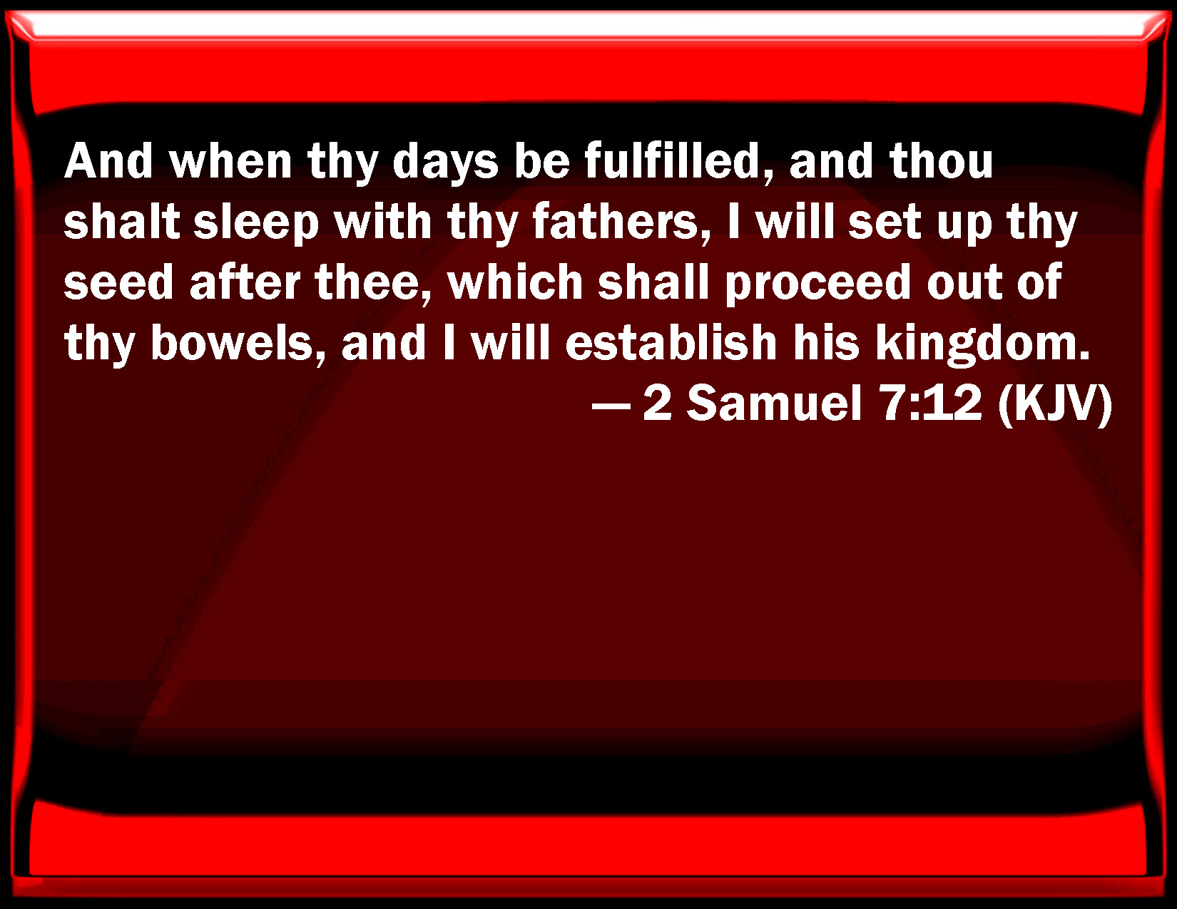 Bible Verse Slide 2 Samuel 7:12 And when your days be fulfilled, and you shall sleep with your fathers, I will set up your seed after you, which shall proceed out of your bowels, and I will establish his kingdom. KJV: And when thy days be fulfilled, and thou shalt sleep with thy fathers, I will set up thy seed after thee, which shall proceed out of thy bowels, and I will establish his kingdom. DRB: And when thy days shall be fulfilled, and thou shalt sleep with thy fathers, I will raise up thy seed after thee, which shall proceed out of thy bowels, and I will establish his kingdom. DBT: When thy days are fulfilled, and thou shalt sleep with thy fathers, I will set up thy seed after thee, which shall proceed out of thy bowels, and I will establish his kingdom. ERV: When thy days be fulfilled, and thou shalt sleep with thy fathers, I will set up thy seed after thee, which shall proceed out of thy bowels, and I will establish his kingdom. WBT: And when thy days shall be fulfilled, and thou shalt sleep with thy fathers, I will set up thy seed after thee, which shall proceed out of thy bowels, and I will establish his kingdom. WEB: When your days are fulfilled, and you shall sleep with your fathers, I will set up your seed after you, who shall proceed out of your bowels, and I will establish his kingdom. YLT: 'When thy days are full, and thou hast lain with thy fathers, then I have raised up thy seed after thee which goeth out from thy bowels, and have established his kingdom;Links 2 Samuel 7:12 NIV • 2 Samuel 7:12 NLT • 2 Samuel 7:12 ESV • 2 Samuel 7:12 NASB • 2 Samuel 7:12 KJV • 2 Samuel 7:12 Interlinear • 2 Samuel 7:12 Commentaries • 2 Samuel 7:12 Parallel Texts • 2 Samuel 7:12 Bible Apps • 2 Samuel 7:12 Parallel • Bible Hub |