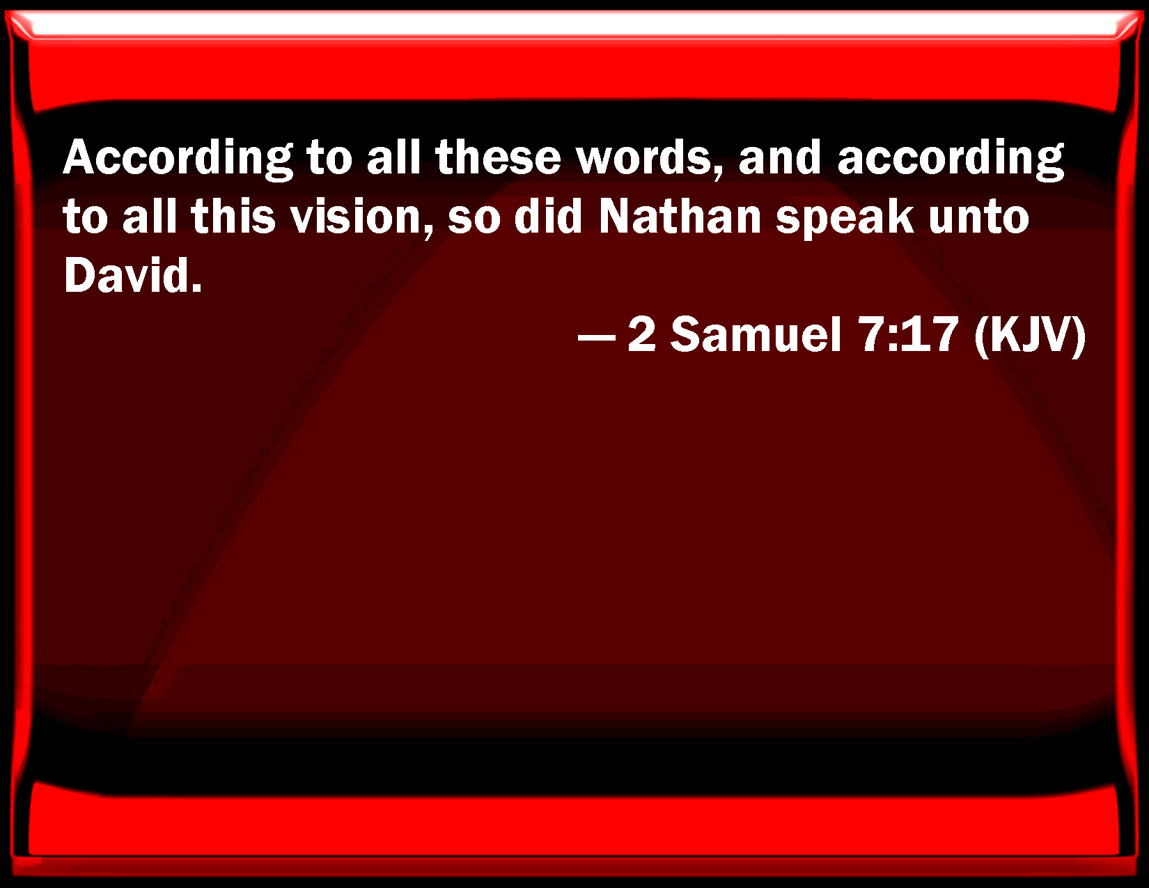 Bible Verse Slide 2 Samuel 7:17 According to all these words, and according to all this vision, so did Nathan speak to David. KJV: According to all these words, and according to all this vision, so did Nathan speak unto David. DRB: According to all these words and according to all this vision, so did Nathan speak to David. DBT: According to all these words, and according to all this vision, so did Nathan speak to David. ERV: According to all these words, and according to all this vision, so did Nathan speak unto David. WBT: According to all these words, and according to all this vision, so did Nathan speak to David. WEB: According to all these words, and according to all this vision, so Nathan spoke to David. YLT: According to all these words, and according to all this vision, so spake Nathan unto David.Links 2 Samuel 7:17 NIV • 2 Samuel 7:17 NLT • 2 Samuel 7:17 ESV • 2 Samuel 7:17 NASB • 2 Samuel 7:17 KJV • 2 Samuel 7:17 Interlinear • 2 Samuel 7:17 Commentaries • 2 Samuel 7:17 Parallel Texts • 2 Samuel 7:17 Bible Apps • 2 Samuel 7:17 Parallel • Bible Hub |
