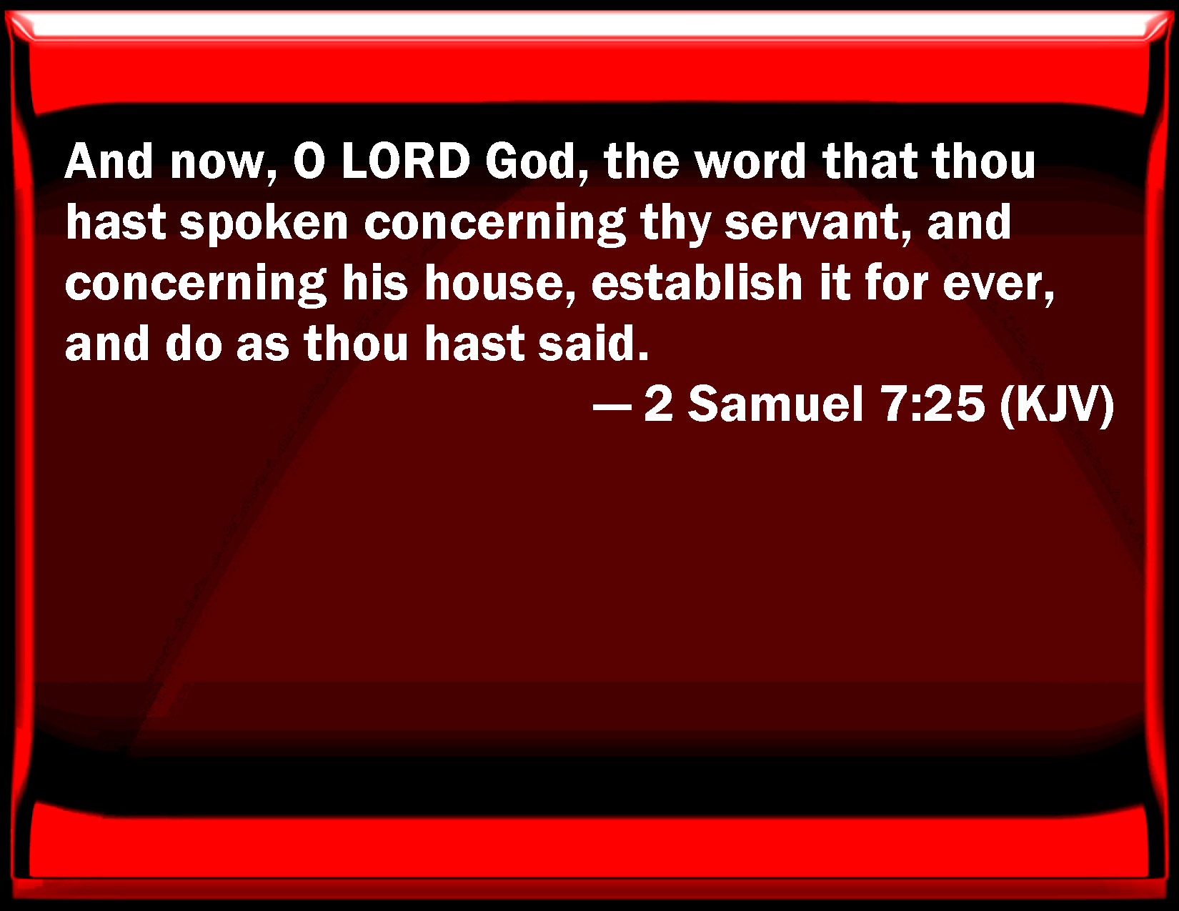 Bible Verse Slide 2 Samuel 7:25 And now, O LORD God, the word that you have spoken concerning your servant, and concerning his house, establish it for ever, and do as you have said. KJV: And now, O LORD God, the word that thou hast spoken concerning thy servant, and concerning his house, establish it for ever, and do as thou hast said. DRB: And now, O Lord God, raise up for ever the word that thou hast spoken, concerning thy servant and concerning his house: and do as thou hast spoken, DBT: And now, Jehovah Elohim, the word that thou hast spoken concerning thy servant and concerning his house, fulfil it for ever, and do as thou hast said. ERV: And now, O LORD God, the word that thou hast spoken concerning thy servant, and concerning his house, confirm thou it for ever, and do as thou hast spoken. WBT: And now, O LORD God, the word that thou hast spoken concerning thy servant, and concerning his house, establish it for ever, and do as thou hast said. WEB: Now, Yahweh God, the word that you have spoken concerning your servant, and concerning his house, confirm it forever, and do as you have spoken. YLT: 'And now, Jehovah God, the word which Thou hast spoken concerning Thy servant, and concerning his house, establish unto the age, and do as Thou hast spoken;Links 2 Samuel 7:25 NIV • 2 Samuel 7:25 NLT • 2 Samuel 7:25 ESV • 2 Samuel 7:25 NASB • 2 Samuel 7:25 KJV • 2 Samuel 7:25 Interlinear • 2 Samuel 7:25 Commentaries • 2 Samuel 7:25 Parallel Texts • 2 Samuel 7:25 Bible Apps • 2 Samuel 7:25 Parallel • Bible Hub |