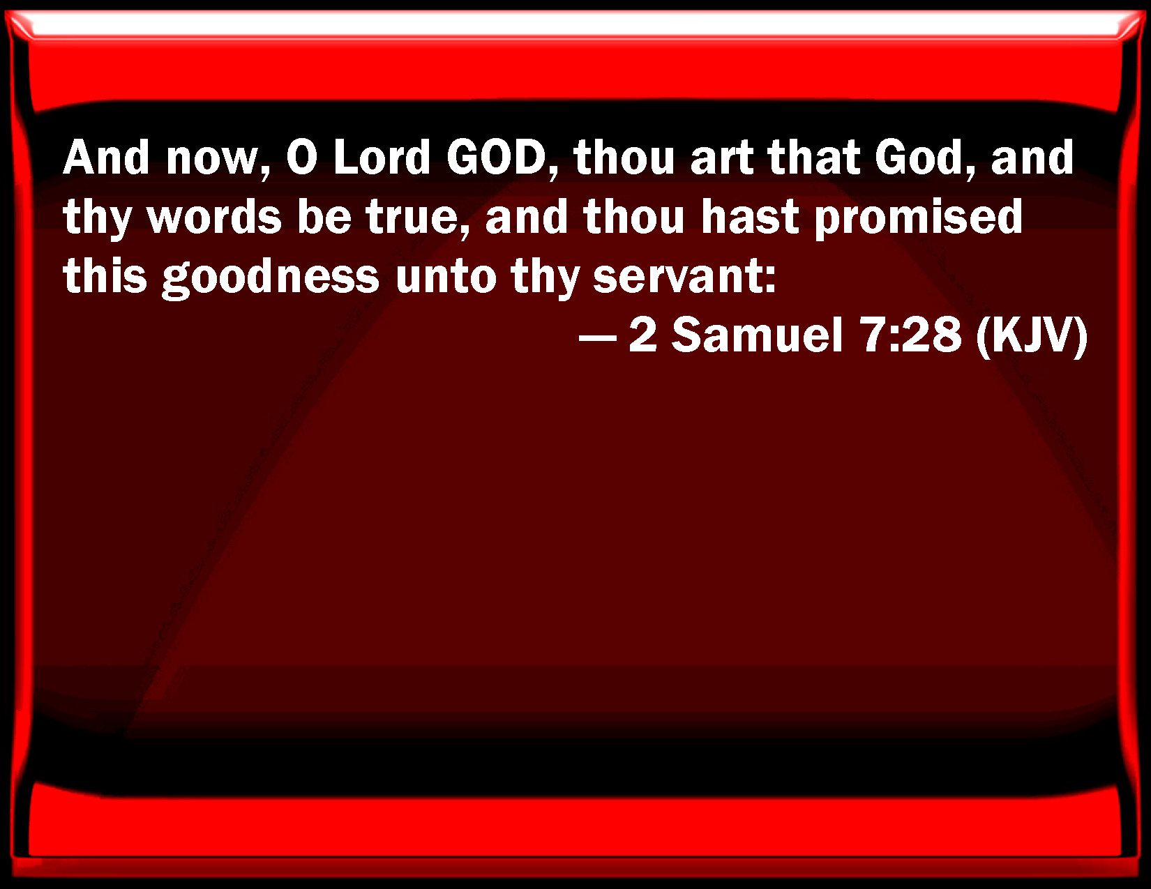 Bible Verse Slide 2 Samuel 7:28 And now, O Lord GOD, you are that God, and your words be true, and you have promised this goodness to your servant: KJV: And now, O Lord GOD, thou art that God, and thy words be true, and thou hast promised this goodness unto thy servant: DRB: And now, O Lord God, thou art God, and thy words shall be true: for thou hast spoken to thy servant these good things. DBT: And now, Lord Jehovah, thou art that God, and thy words are true, and thou hast promised this goodness unto thy servant; ERV: And now, O Lord GOD, thou art God, and thy words are truth, and thou hast promised this good thing unto thy servant: WBT: And now, O Lord GOD, thou art that God, and thy words are true, and thou hast promised this goodness to thy servant: WEB: "Now, O Lord Yahweh, you are God, and your words are truth, and you have promised this good thing to your servant. YLT: And now, Lord Jehovah, Thou art God Himself, and Thy words are truth, and Thou speakest unto Thy servant this goodness,Links 2 Samuel 7:28 NIV • 2 Samuel 7:28 NLT • 2 Samuel 7:28 ESV • 2 Samuel 7:28 NASB • 2 Samuel 7:28 KJV • 2 Samuel 7:28 Interlinear • 2 Samuel 7:28 Commentaries • 2 Samuel 7:28 Parallel Texts • 2 Samuel 7:28 Bible Apps • 2 Samuel 7:28 Parallel • Bible Hub |