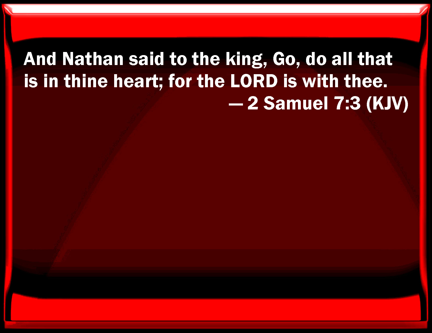 Bible Verse Slide 2 Samuel 7:3 And Nathan said to the king, Go, do all that is in your heart; for the LORD is with you. KJV: And Nathan said to the king, Go, do all that is in thine heart; for the LORD is with thee. DRB: And Nathan said to the king: Go, do all that is in thy heart: because the Lord is with thee. DBT: And Nathan said to the king, Go, do all that is in thy heart; for Jehovah is with thee. ERV: And Nathan said to the king, Go, do all that is in thine heart; for the LORD is with thee. WBT: And Nathan said to the king, Go, do all that is in thy heart: for the LORD is with thee. WEB: Nathan said to the king, "Go, do all that is in your heart; for Yahweh is with you." YLT: And Nathan saith unto the king, 'All that is in thine heart — go, do, for Jehovah is with thee.'Links 2 Samuel 7:3 NIV • 2 Samuel 7:3 NLT • 2 Samuel 7:3 ESV • 2 Samuel 7:3 NASB • 2 Samuel 7:3 KJV • 2 Samuel 7:3 Interlinear • 2 Samuel 7:3 Commentaries • 2 Samuel 7:3 Parallel Texts • 2 Samuel 7:3 Bible Apps • 2 Samuel 7:3 Parallel • Bible Hub |