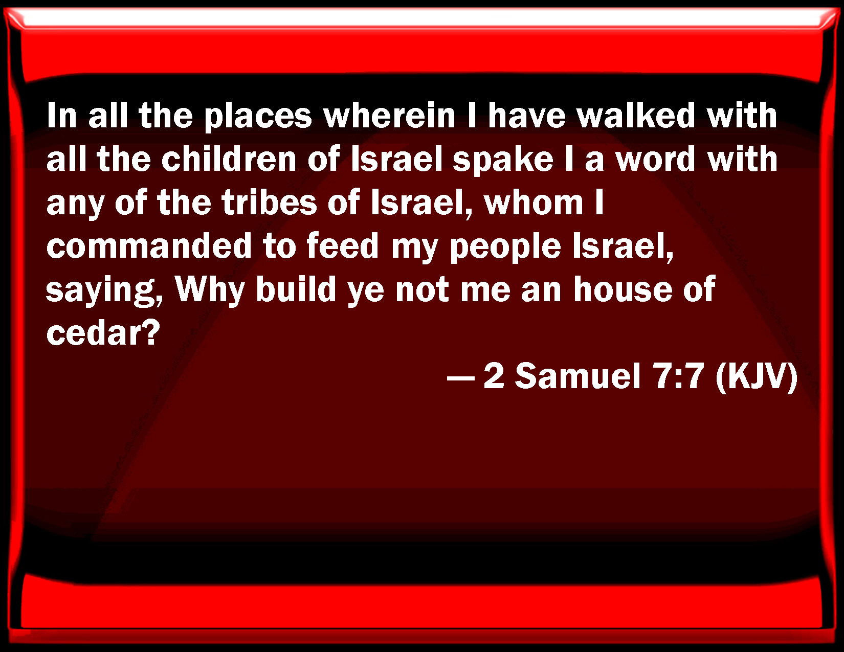 Bible Verse Slide 2 Samuel 7:7 In all the places wherein I have walked with all the children of Israel spoke I a word with any of the tribes of Israel, whom I commanded to feed my people Israel, saying, Why build you not me an house of cedar? KJV: In all the places wherein I have walked with all the children of Israel spake I a word with any of the tribes of Israel, whom I commanded to feed my people Israel, saying, Why build ye not me an house of cedar? DRB: In all the places that I have gone through with all the children of Israel, did ever I speak a word to any one of the tribes of Israel, whom I commanded to feed my people Israel, saying: Why have you not built me a house of cedar? DBT: In all my going about with all the children of Israel, did I speak a word with any of the tribes of Israel, whom I commanded to feed my people Israel, saying, Why build ye me not a house of cedars? ERV: In all places wherein I have walked with all the children of Israel, spake I a word with any of the tribes of Israel, whom I commanded to feed my people Israel, saying, Why have ye not built me an house of cedar? WBT: In all the places in which I have walked with all the children of Israel have I spoken a word with any of the tribes of Israel, whom I commanded to feed my people Israel, saying, Why do ye not build me a house of cedar? WEB: In all places in which I have walked with all the children of Israel, did I say a word to any of the tribes of Israel, whom I commanded to be shepherd of my people Israel, saying, 'Why have you not built me a house of cedar?'"' YLT: During all the time that I have walked up and down among all the sons of Israel, a word have I spoken with one of the tribes of Israel which I commanded to feed my people Israel, saying, 'Why have ye not built to Me a house of cedars?Links 2 Samuel 7:7 NIV • 2 Samuel 7:7 NLT • 2 Samuel 7:7 ESV • 2 Samuel 7:7 NASB • 2 Samuel 7:7 KJV • 2 Samuel 7:7 Interlinear • 2 Samuel 7:7 Commentaries • 2 Samuel 7:7 Parallel Texts • 2 Samuel 7:7 Bible Apps • 2 Samuel 7:7 Parallel • Bible Hub |