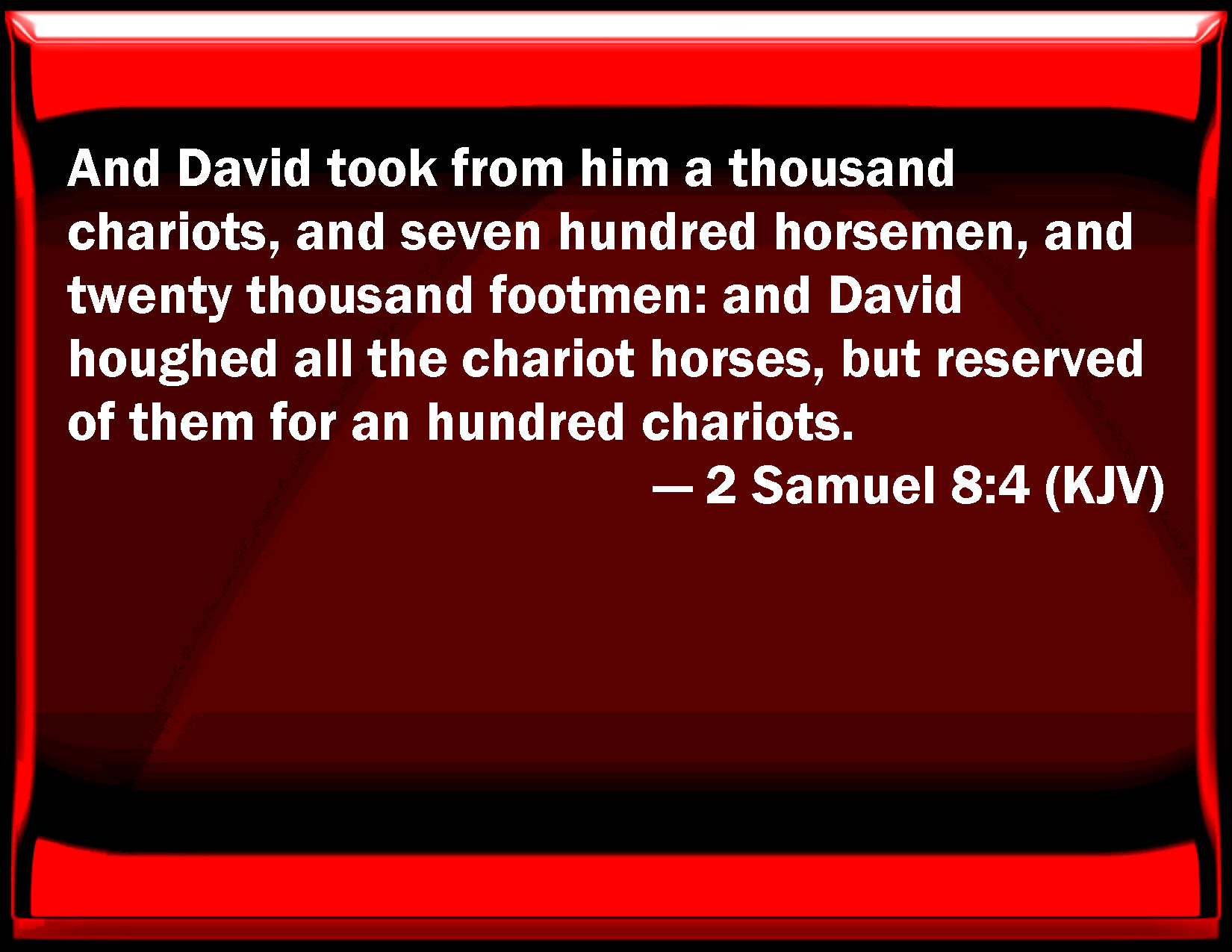 Bible Verse Slide 2 Samuel 8:4 And David took from him a thousand chariots, and seven hundred horsemen, and twenty thousand footmen: and David hamstrung all the chariot horses, but reserved of them for an hundred chariots. KJV: And David took from him a thousand chariots, and seven hundred horsemen, and twenty thousand footmen: and David houghed all the chariot horses, but reserved of them for an hundred chariots. DRB: And David took from him a thousand and seven hundred horsemen, and twenty thousand footmen, and houghed all the chariot horses: and only reserved of them for one hundred chariots. DBT: And David took from him one thousand seven hundred horsemen, and twenty thousand footmen; and David houghed all the chariot horses, but reserved of them for a hundred chariots. ERV: And David took from him a thousand and seven hundred horsemen, and twenty thousand footmen: and David houghed all the chariot horses, but reserved of them for an hundred chariots. WBT: And David took from him a thousand chariots, and seven hundred horsemen, and twenty thousand footmen: and David houghed all the chariot-horses, but reserved of them for a hundred chariots. WEB: David took from him one thousand seven hundred horsemen, and twenty thousand footmen: and David hamstrung all the chariot horses, but reserved of them for one hundred chariots. YLT: and David captureth from him a thousand and seven hundred horsemen, and twenty thousand footmen, and David destroyeth utterly the whole of the charioteers, only he leaveth of them a hundred charioteers.Links 2 Samuel 8:4 NIV • 2 Samuel 8:4 NLT • 2 Samuel 8:4 ESV • 2 Samuel 8:4 NASB • 2 Samuel 8:4 KJV • 2 Samuel 8:4 Interlinear • 2 Samuel 8:4 Commentaries • 2 Samuel 8:4 Parallel Texts • 2 Samuel 8:4 Bible Apps • 2 Samuel 8:4 Parallel • Bible Hub |