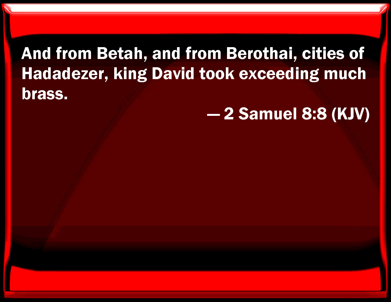 Bible Verse Slide 2 Samuel 8:8 And from Betah, and from Berothai, cities of Hadadezer, king David took exceeding much brass. KJV: And from Betah, and from Berothai, cities of Hadadezer, king David took exceeding much brass. DRB: And out of Bete, and out of Beroth, cities of Adarezer, king David took an exceeding great quantity of brass. DBT: And from Betah, and from Berothai, cities of Hadadezer, king David took exceeding much bronze. ERV: And from Betah and from Berothai, cities of Hadadezer, king David took exceeding much brass. WBT: And from Betah, and from Berothai, cities of Hadadezer, king David took very much brass. WEB: From Betah and from Berothai, cities of Hadadezer, king David took exceeding much brass. YLT: and from Betah, and from Berothai, cities of Hadadezer, hath king David taken very much brass.Links 2 Samuel 8:8 NIV • 2 Samuel 8:8 NLT • 2 Samuel 8:8 ESV • 2 Samuel 8:8 NASB • 2 Samuel 8:8 KJV • 2 Samuel 8:8 Interlinear • 2 Samuel 8:8 Commentaries • 2 Samuel 8:8 Parallel Texts • 2 Samuel 8:8 Bible Apps • 2 Samuel 8:8 Parallel • Bible Hub |