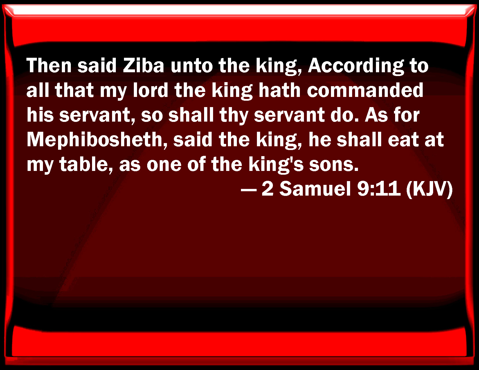 Bible Verse Slide 2 Samuel 9:11 Then said Ziba to the king, According to all that my lord the king has commanded his servant, so shall your servant do. As for Mephibosheth, said the king, he shall eat at my table, as one of the king's sons. KJV: Then said Ziba unto the king, According to all that my lord the king hath commanded his servant, so shall thy servant do. As for Mephibosheth, said the king, he shall eat at my table, as one of the king's sons. DRB: And Siba said to the king: As thou my lord the king hast commanded thy servant, so will thy servant do: and Miphiboseth shall eat at my table, as one of the sons of the king. DBT: And Ziba said to the king, According to all that my lord the king has commanded his servant, so will thy servant do. And Mephibosheth said David shall eat at my table, as one of the king's sons. ERV: Then said Ziba unto the king, According to all that my lord the king commandeth his servant, so shall thy servant do. As for Mephibosheth, said the king, he shall eat at my table, as one of the kings sons. WBT: Then said Ziba to the king, According to all that my lord the king hath commanded his servant, so shall thy servant do. As for Mephibosheth, said the king, he shall eat at my table, as one of the king's sons. WEB: Then Ziba said to the king, "According to all that my lord the king commands his servant, so your shall servant do." So Mephibosheth ate at the king's table, like one of the king's sons. YLT: And Ziba saith unto the king, 'According to all that my lord the king commandeth his servant, so doth thy servant;' as to Mephibosheth, 'he is eating at my table (saith the king) as one of the sons of the king.'Links 2 Samuel 9:11 NIV • 2 Samuel 9:11 NLT • 2 Samuel 9:11 ESV • 2 Samuel 9:11 NASB • 2 Samuel 9:11 KJV • 2 Samuel 9:11 Interlinear • 2 Samuel 9:11 Commentaries • 2 Samuel 9:11 Parallel Texts • 2 Samuel 9:11 Bible Apps • 2 Samuel 9:11 Parallel • Bible Hub |