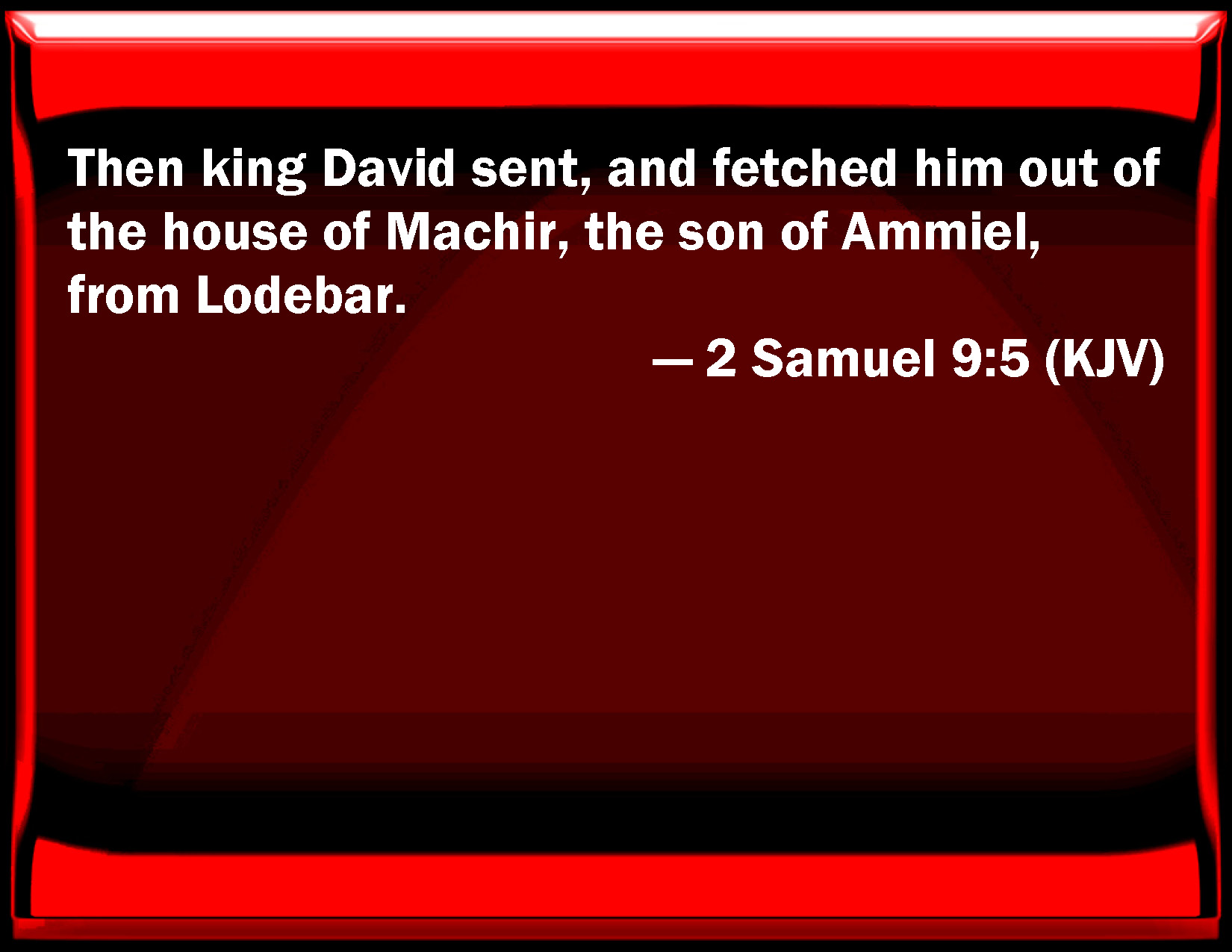 Bible Verse Slide 2 Samuel 9:5 Then king David sent, and fetched him out of the house of Machir, the son of Ammiel, from Lodebar. KJV: Then king David sent, and fetched him out of the house of Machir, the son of Ammiel, from Lodebar. DRB: Then king David sent, and brought him out of the house of Machir the son of Ammiel of Lodabar. DBT: And king David sent, and fetched him out of the house of Machir the son of Ammiel, from Lodebar. ERV: Then king David sent, and fetched him out of the house of Machir the son of Ammiel, from Lo-debar. WBT: Then king David sent, and brought him from the house of Machir, the son of Ammiel, from Lo-debar. WEB: Then king David sent, and fetched him out of the house of Machir the son of Ammiel, from Lo Debar. YLT: And king David sendeth, and taketh him out of the house of Machir son of Ammiel, of Lo-Debar,Links 2 Samuel 9:5 NIV • 2 Samuel 9:5 NLT • 2 Samuel 9:5 ESV • 2 Samuel 9:5 NASB • 2 Samuel 9:5 KJV • 2 Samuel 9:5 Interlinear • 2 Samuel 9:5 Commentaries • 2 Samuel 9:5 Parallel Texts • 2 Samuel 9:5 Bible Apps • 2 Samuel 9:5 Parallel • Bible Hub |