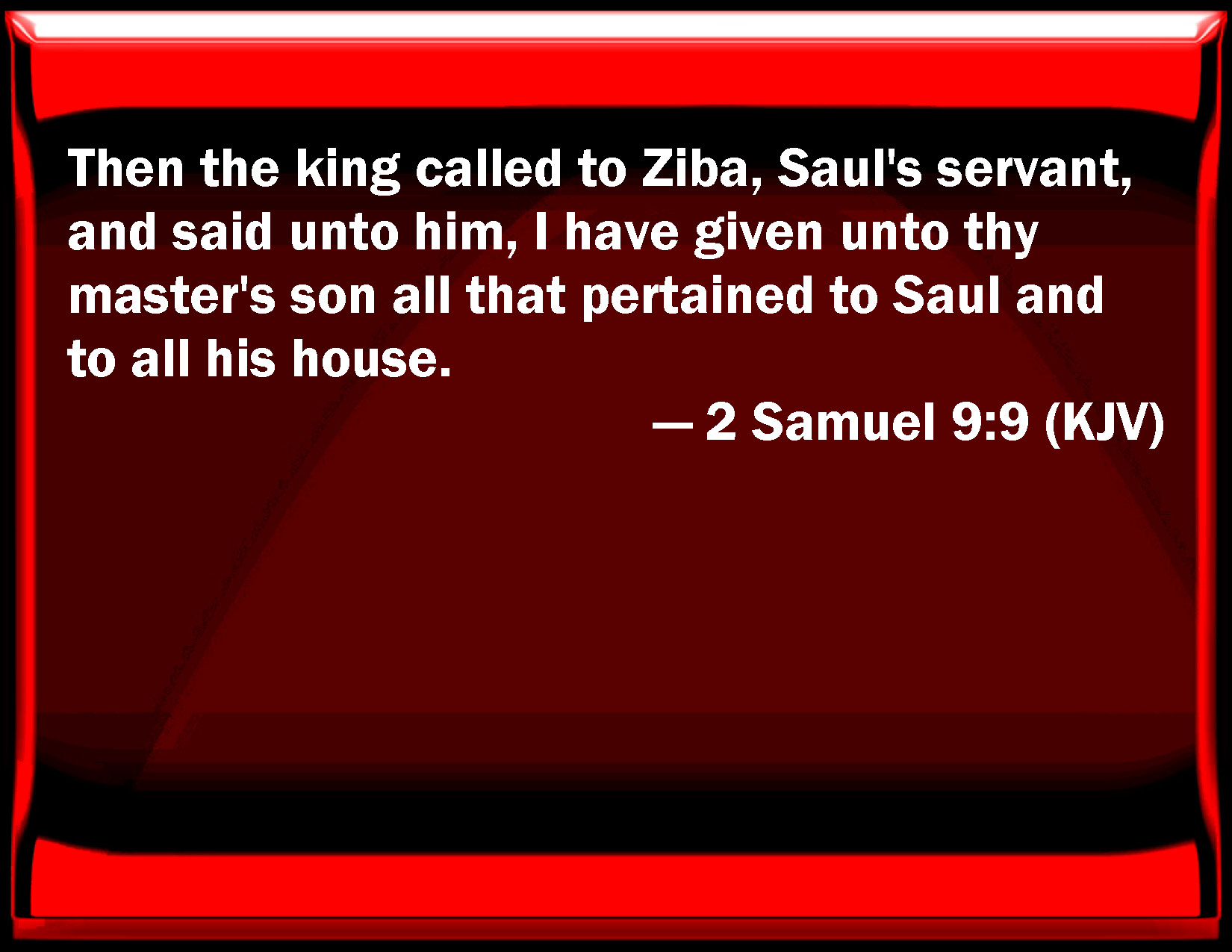 Bible Verse Slide 2 Samuel 9:9 Then the king called to Ziba, Saul's servant, and said to him, I have given to your master's son all that pertained to Saul and to all his house. KJV: Then the king called to Ziba, Saul's servant, and said unto him, I have given unto thy master's son all that pertained to Saul and to all his house. DRB: Then the king called Siba the servant of Saul, and said to him: All that belonged to Saul, and all his house, I have given to thy master's son. DBT: Then the king called Ziba, Saul's servant, and said to him, I have given to thy master's son all that belonged to Saul and to all his house. ERV: Then the king called to Ziba, Saul's servant, and said unto him, All that pertained to Saul and to all his house have I given unto thy master's son. WBT: Then the king called to Ziba, Saul's servant, and said to him, I have given to thy master's son all that pertained to Saul, and to all his house. WEB: Then the king called to Ziba, Saul's servant, and said to him, "All that pertained to Saul and to all his house have I given to your master's son. YLT: And the king calleth unto Ziba servant of Saul, and saith unto him, 'All that was to Saul and to all his house, I have given to the son of thy lord,Links 2 Samuel 9:9 NIV • 2 Samuel 9:9 NLT • 2 Samuel 9:9 ESV • 2 Samuel 9:9 NASB • 2 Samuel 9:9 KJV • 2 Samuel 9:9 Interlinear • 2 Samuel 9:9 Commentaries • 2 Samuel 9:9 Parallel Texts • 2 Samuel 9:9 Bible Apps • 2 Samuel 9:9 Parallel • Bible Hub |