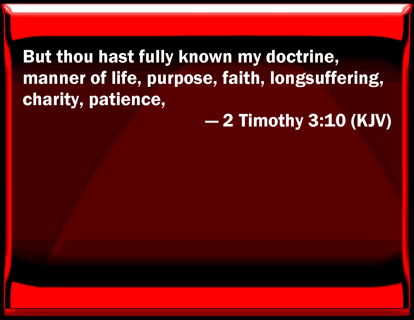 Bible Verse Slide 2 Timothy 3:10 But you have fully known my doctrine, manner of life, purpose, faith, long-suffering, charity, patience, KJV: But thou hast fully known my doctrine, manner of life, purpose, faith, longsuffering, charity, patience, DRB: But thou hast fully known my doctrine, manner of life, purpose, faith, longsuffering, love, patience, DBT: But thou hast been thoroughly acquainted with my teaching, conduct, purpose, faith, longsuffering, love, endurance, ERV: But thou didst follow my teaching, conduct, purpose, faith, longsuffering, love, patience, WBT: But thou hast fully known my doctrine, manner of life, purpose, faith, long-suffering, charity, patience, WEB: But you did follow my teaching, conduct, purpose, faith, patience, love, steadfastness, YLT: And thou — thou hast followed after my teaching, manner of life, purpose, faith, long-suffering, love, endurance,Links 2 Timothy 3:10 NIV • 2 Timothy 3:10 NLT • 2 Timothy 3:10 ESV • 2 Timothy 3:10 NASB • 2 Timothy 3:10 KJV • 2 Timothy 3:10 Interlinear • 2 Timothy 3:10 Commentaries • 2 Timothy 3:10 Parallel Texts • 2 Timothy 3:10 Bible Apps • 2 Timothy 3:10 Parallel • Bible Hub |