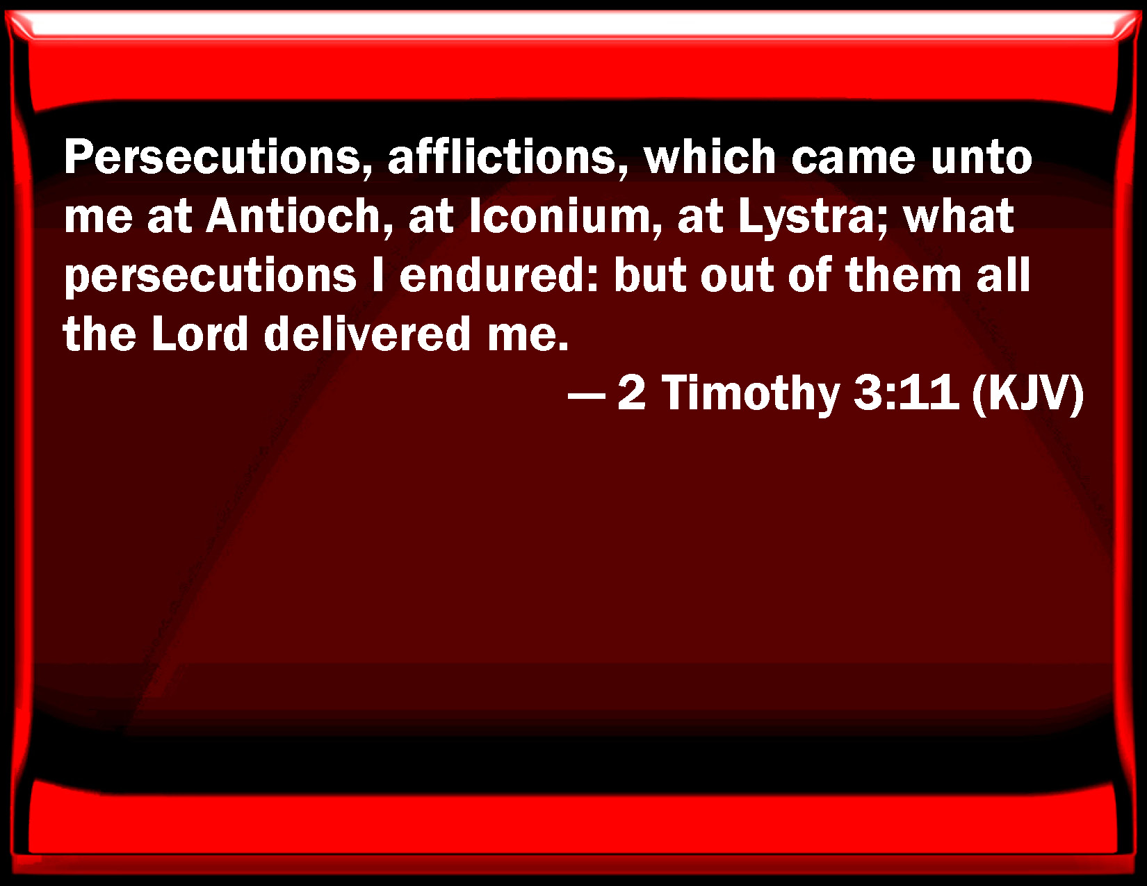 Bible Verse Slide 2 Timothy 3:11 Persecutions, afflictions, which came to me at Antioch, at Iconium, at Lystra; what persecutions I endured: but out of them all the Lord delivered me. KJV: Persecutions, afflictions, which came unto me at Antioch, at Iconium, at Lystra; what persecutions I endured: but out of them all the Lord delivered me. DRB: Persecutions, afflictions: such as came upon me at Antioch, at Iconium, and at Lystra: what persecutions I endured, and out of them all the Lord delivered me. DBT: persecutions, sufferings: what sufferings happened to me in Antioch, in Iconium, in Lystra; what persecutions I endured; and the Lord delivered me out of all. ERV: persecutions, sufferings; what things befell me at Antioch, at Iconium, at Lystra; what persecutions I endured: and out of them all the Lord delivered me. WBT: Persecutions, afflictions which came to me at Antioch, at Iconium, at Lystra; what persecutions I endured: but out of them all the Lord delivered me. WEB: persecutions, and sufferings: those things that happened to me at Antioch, Iconium, and Lystra. I endured those persecutions. Out of them all the Lord delivered me. YLT: the persecutions, the afflictions, that befell me in Antioch, in Iconium, in Lystra; what persecutions I endured, and out of all the Lord did deliver me,Links 2 Timothy 3:11 NIV • 2 Timothy 3:11 NLT • 2 Timothy 3:11 ESV • 2 Timothy 3:11 NASB • 2 Timothy 3:11 KJV • 2 Timothy 3:11 Interlinear • 2 Timothy 3:11 Commentaries • 2 Timothy 3:11 Parallel Texts • 2 Timothy 3:11 Bible Apps • 2 Timothy 3:11 Parallel • Bible Hub |