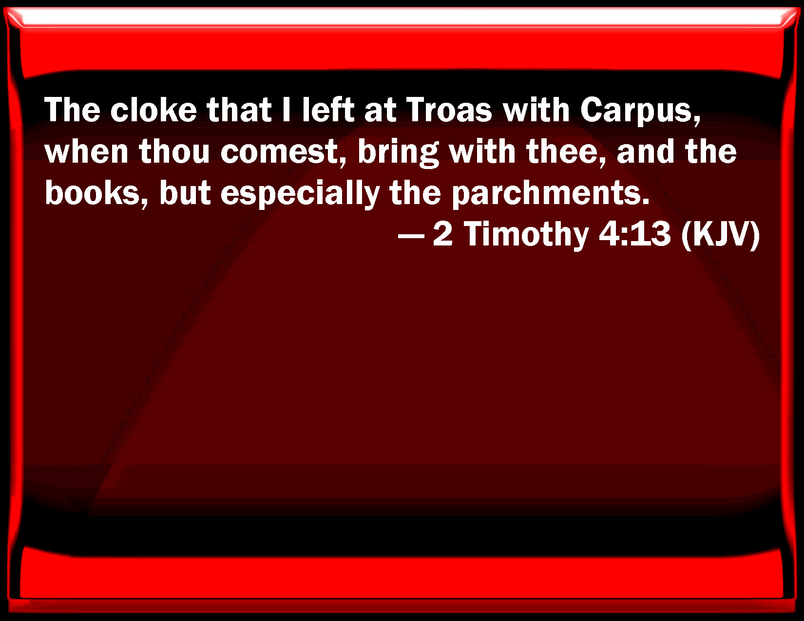 Bible Verse Slide 2 Timothy 4:13 The cloak that I left at Troas with Carpus, when you come, bring with you, and the books, but especially the parchments. KJV: The cloke that I left at Troas with Carpus, when thou comest, bring with thee, and the books, but especially the parchments. DRB: The cloak that I left at Troas, with Carpus, when thou comest, bring with thee, and the books, especially the parchments. DBT: The cloak which I left behind me in Troas at Carpus's, bring when thou comest, and the books, especially the parchments. ERV: The cloke that I left at Troas with Carpus, bring when thou comest, and the books, especially the parchments. WBT: The cloke that I left at Troas with Carpus, when thou comest, bring with thee, and the books, but especially the parchments. WEB: Bring the cloak that I left at Troas with Carpus when you come, and the books, especially the parchments. YLT: the cloak that I left in Troas with Carpus, coming, bring thou and the books — especially the parchments.Links 2 Timothy 4:13 NIV • 2 Timothy 4:13 NLT • 2 Timothy 4:13 ESV • 2 Timothy 4:13 NASB • 2 Timothy 4:13 KJV • 2 Timothy 4:13 Interlinear • 2 Timothy 4:13 Commentaries • 2 Timothy 4:13 Parallel Texts • 2 Timothy 4:13 Bible Apps • 2 Timothy 4:13 Parallel • Bible Hub |