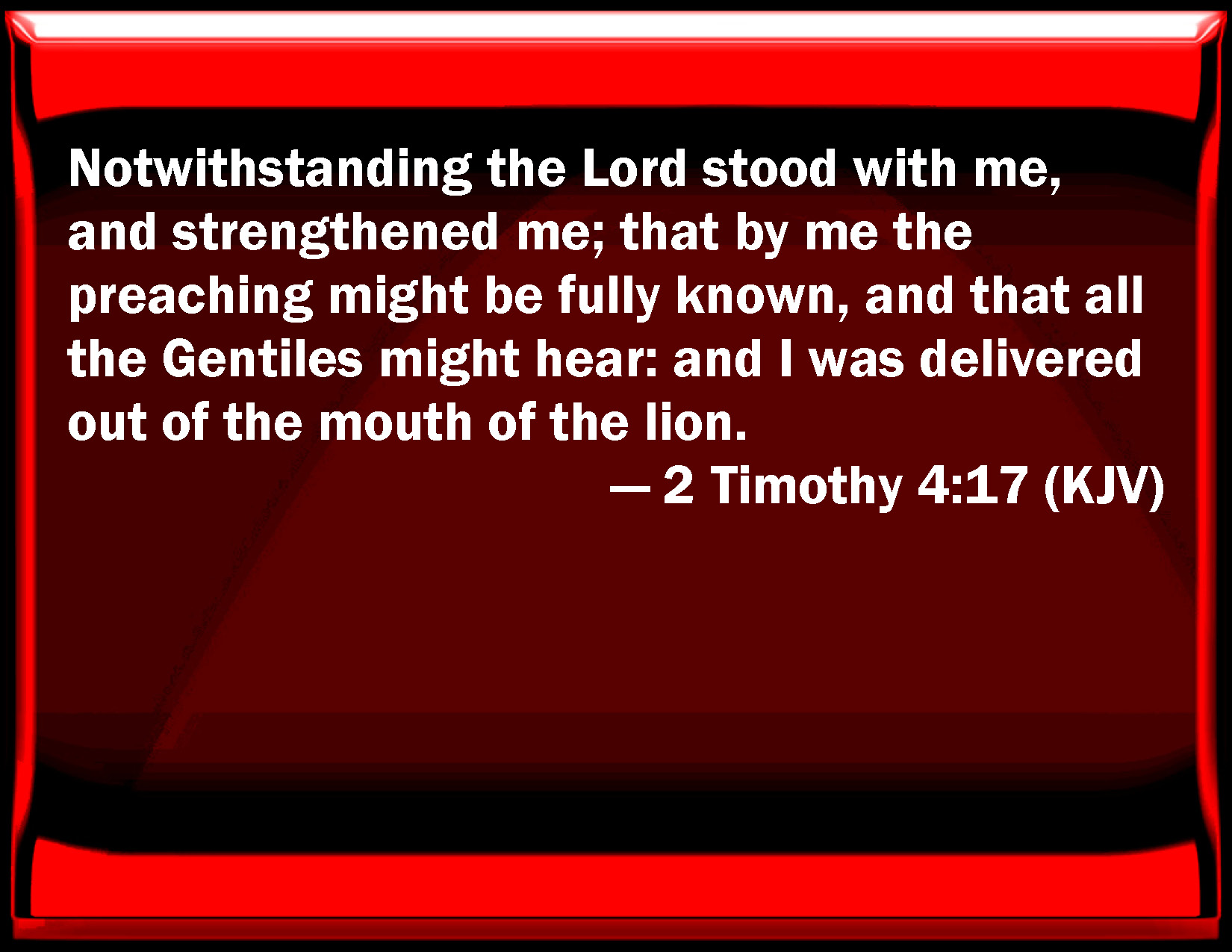 2 Timothy 4:17 Notwithstanding the Lord stood with me, and strengthened me; that by me the preaching might be fully known, and that all the Gentiles might hear: and I was delivered out of the mouth of the lion.