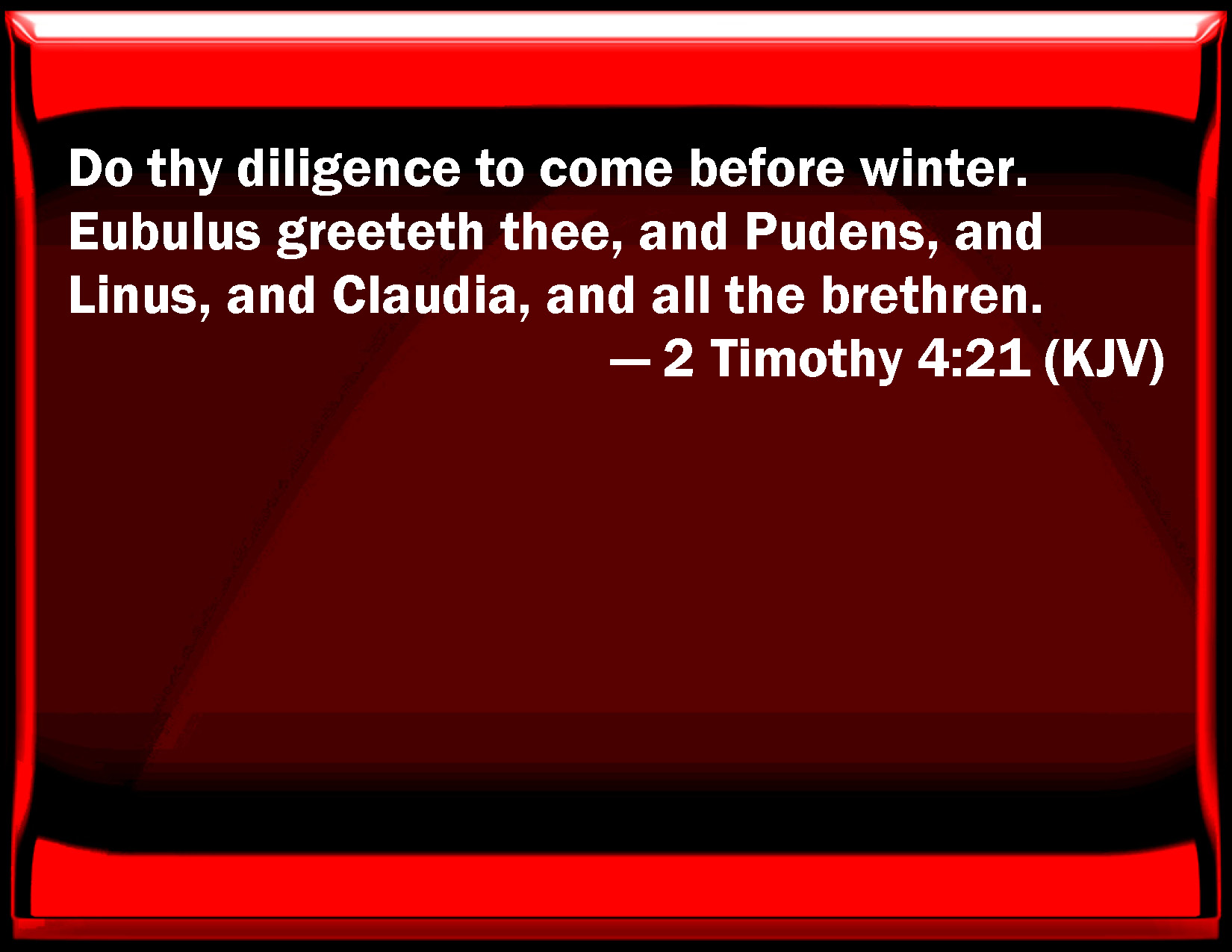 Bible Verse Slide 2 Timothy 4:21 Do your diligence to come before winter. Eubulus greets you, and Pudens, and Linus, and Claudia, and all the brothers. KJV: Do thy diligence to come before winter. Eubulus greeteth thee, and Pudens, and Linus, and Claudia, and all the brethren. DRB: Make haste to come before winter Eubulus and Pudens, and Linus and Claudia, and all the brethren, salute thee. DBT: Use diligence to come before winter. Eubulus salutes thee, and Pudens, and Linus, and Claudia, and the brethren all. ERV: Do thy diligence to come before winter. Eubulus saluteth thee, and Pudens, and Linus, and Claudia, and all the brethren. WBT: Do thy diligence to come before winter. Eubulus greeteth thee, and Pudens, and Linus, and Claudia, and all the brethren. WEB: Be diligent to come before winter. Eubulus salutes you, as do Pudens, Linus, Claudia, and all the brothers. YLT: be diligent to come before winter. Salute thee doth Eubulus, and Pudens, and Linus, and Claudia, and all the brethren.Links 2 Timothy 4:21 NIV • 2 Timothy 4:21 NLT • 2 Timothy 4:21 ESV • 2 Timothy 4:21 NASB • 2 Timothy 4:21 KJV • 2 Timothy 4:21 Interlinear • 2 Timothy 4:21 Commentaries • 2 Timothy 4:21 Parallel Texts • 2 Timothy 4:21 Bible Apps • 2 Timothy 4:21 Parallel • Bible Hub |