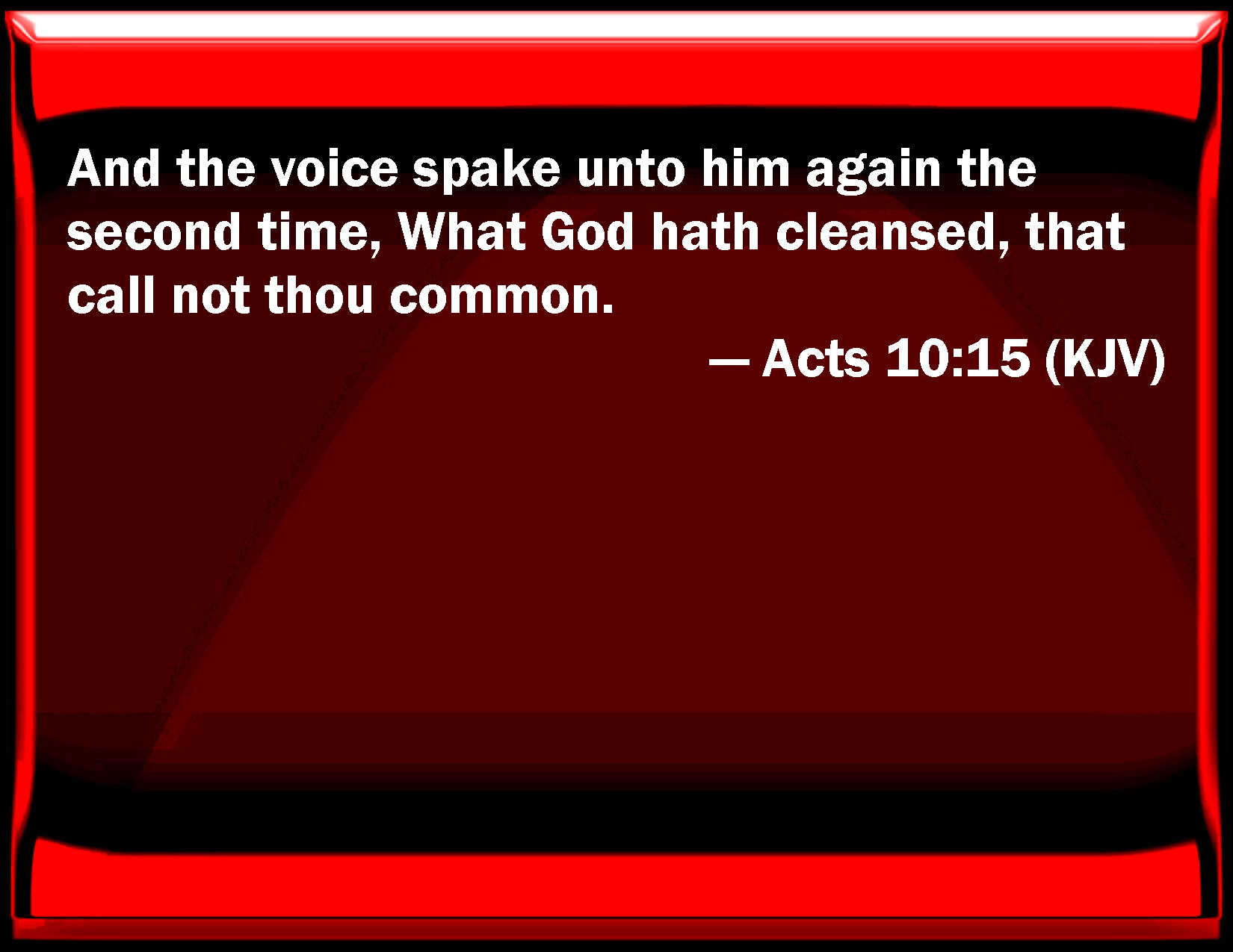 Bible Verse Slide Acts 10:15 And the voice spoke to him again the second time, What God has cleansed, that call not you common. KJV: And the voice spake unto him again the second time, What God hath cleansed, that call not thou common. DRB: And the voice spoke to him again the second time: That which God hath cleansed, do not thou call common. DBT: And there was a voice again the second time to him, What God has cleansed, do not thou make common. ERV: And a voice came unto him again the second time, What God hath cleansed, make not thou common. WBT: And the voice spoke to him again the second time, What God hath cleansed, that call not thou common. WEB: A voice came to him again the second time, "What God has cleansed, you must not call unclean." YLT: and there is a voice again a second time unto him: 'What God did cleanse, thou, declare not thou common;'Links Acts 10:15 NIV • Acts 10:15 NLT • Acts 10:15 ESV • Acts 10:15 NASB • Acts 10:15 KJV • Acts 10:15 Interlinear • Acts 10:15 Commentaries • Acts 10:15 Parallel Texts • Acts 10:15 Bible Apps • Acts 10:15 Parallel • Bible Hub |