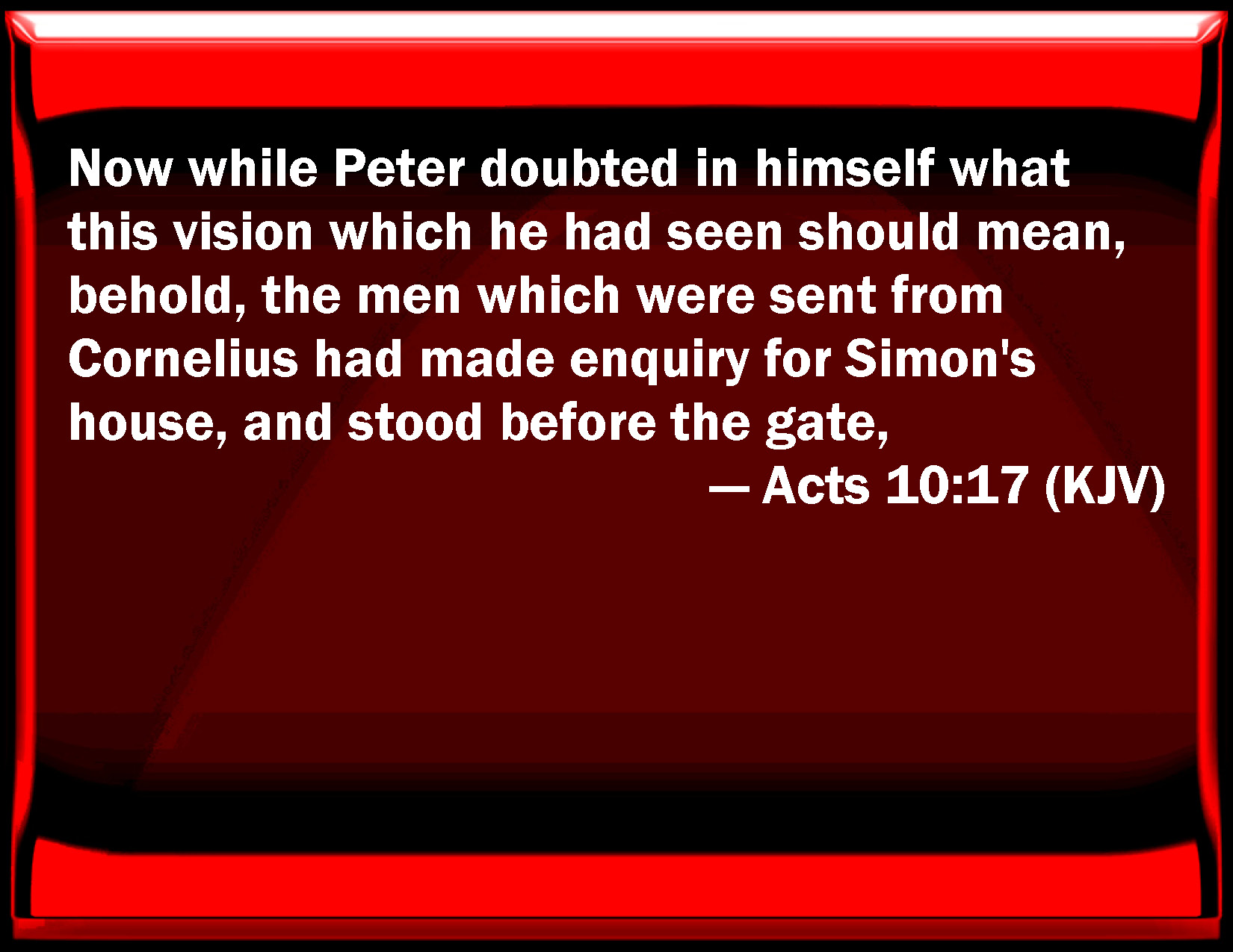 Bible Verse Slide Acts 10:17 Now while Peter doubted in himself what this vision which he had seen should mean, behold, the men which were sent from Cornelius had made enquiry for Simon's house, and stood before the gate, KJV: Now while Peter doubted in himself what this vision which he had seen should mean, behold, the men which were sent from Cornelius had made inquiry for Simon's house, and stood before the gate, DRB: Now, whilst Peter was doubting within himself, what the vision that he had seen should mean, behold the men who were sent from Cornelius, inquiring for Simon's house, stood at the gate. DBT: And as Peter doubted in himself what the vision which he had seen might mean, behold also the men who were sent by Cornelius, having sought out the house of Simon, stood at the gate, ERV: Now while Peter was much perplexed in himself what the vision which he had seen might mean, behold, the men that were sent by Cornelius, having made inquiry for Simon's house, stood before the gate, WBT: Now while Peter doubted in himself what this vision which he had seen should mean, behold, the men who were sent from Cornelius had made inquiry for Simon's house, and were standing before the gate, WEB: Now while Peter was very perplexed in himself what the vision which he had seen might mean, behold, the men who were sent by Cornelius, having made inquiry for Simon's house, stood before the gate, YLT: And as Peter was perplexed in himself what the vision that he saw might be, then, lo, the men who have been sent from Cornelius, having made inquiry for the house of Simon, stood at the gate,Links Acts 10:17 NIV • Acts 10:17 NLT • Acts 10:17 ESV • Acts 10:17 NASB • Acts 10:17 KJV • Acts 10:17 Interlinear • Acts 10:17 Commentaries • Acts 10:17 Parallel Texts • Acts 10:17 Bible Apps • Acts 10:17 Parallel • Bible Hub |