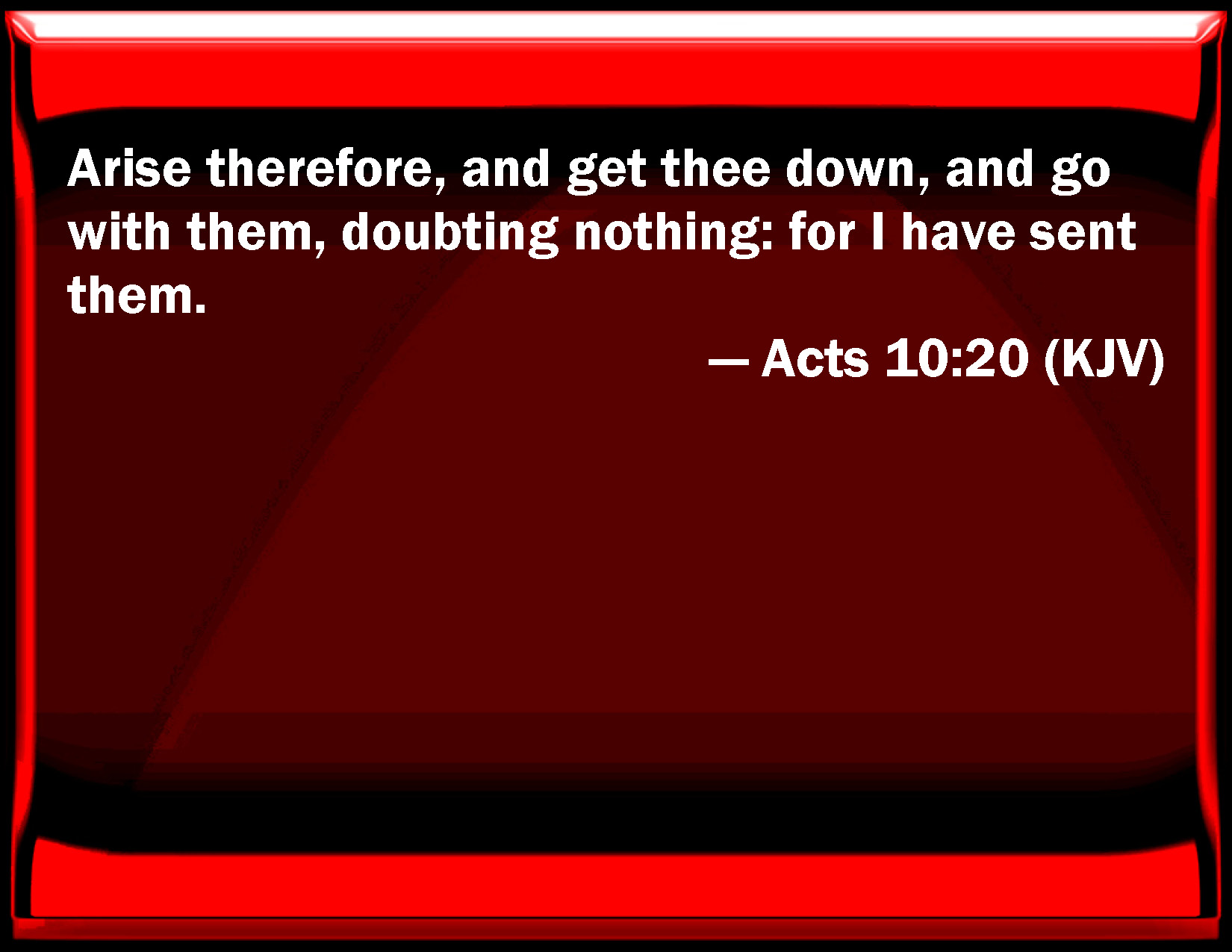 Bible Verse Slide Acts 10:20 Arise therefore, and get you down, and go with them, doubting nothing: for I have sent them. KJV: Arise therefore, and get thee down, and go with them, doubting nothing: for I have sent them. DRB: Arise, therefore, get thee down and go with them, doubting nothing: for I have sent them. DBT: but rise up, go down, and go with them, nothing doubting, because I have sent them. ERV: But arise, and get thee down, and go with them, nothing doubting: for I have sent them. WBT: Arise therefore, and go down, and go with them, doubting nothing: for I have sent them. WEB: But arise, get down, and go with them, doubting nothing; for I have sent them." YLT: but having risen, go down and go on with them, nothing doubting, because I have sent them;'Links Acts 10:20 NIV • Acts 10:20 NLT • Acts 10:20 ESV • Acts 10:20 NASB • Acts 10:20 KJV • Acts 10:20 Interlinear • Acts 10:20 Commentaries • Acts 10:20 Parallel Texts • Acts 10:20 Bible Apps • Acts 10:20 Parallel • Bible Hub |